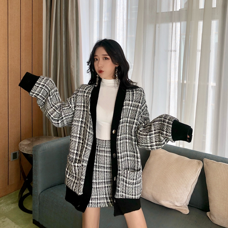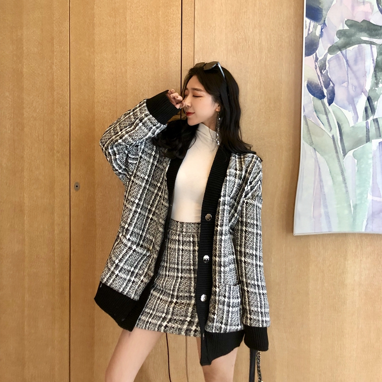 / chic小香風開衫黑領外套A字半裙格子港風時尚套裝新款韓版兩件套
