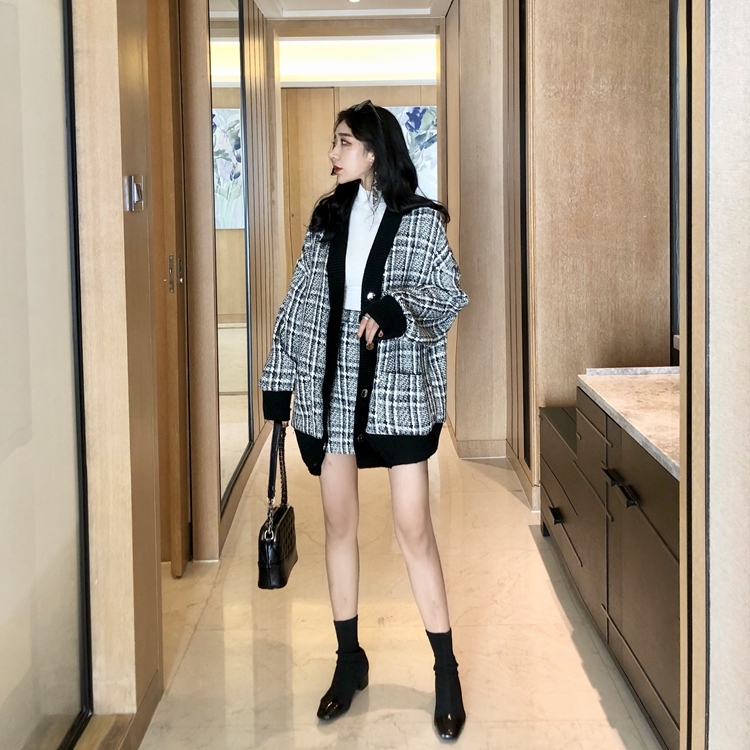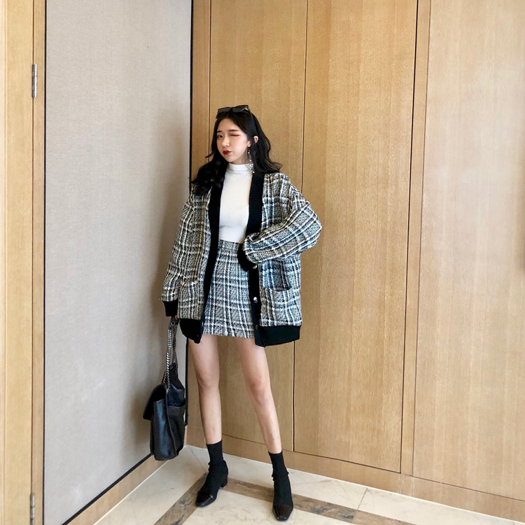 chic小香風開衫黑領外套A字半裙格子港風時尚套裝新款韓版兩件套