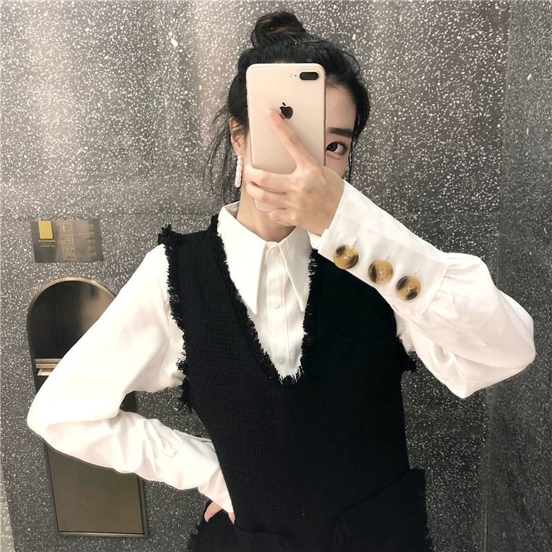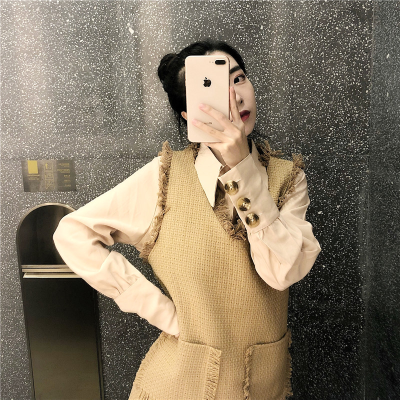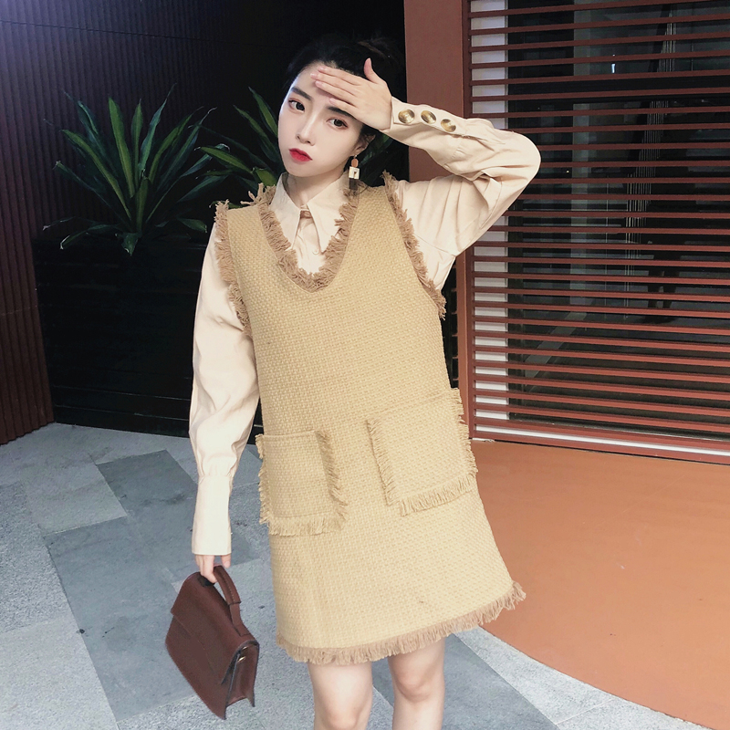 / 秋裝小香風粗花呢中長款V領馬甲背心裙小翻領純色襯衫女時尚套裝