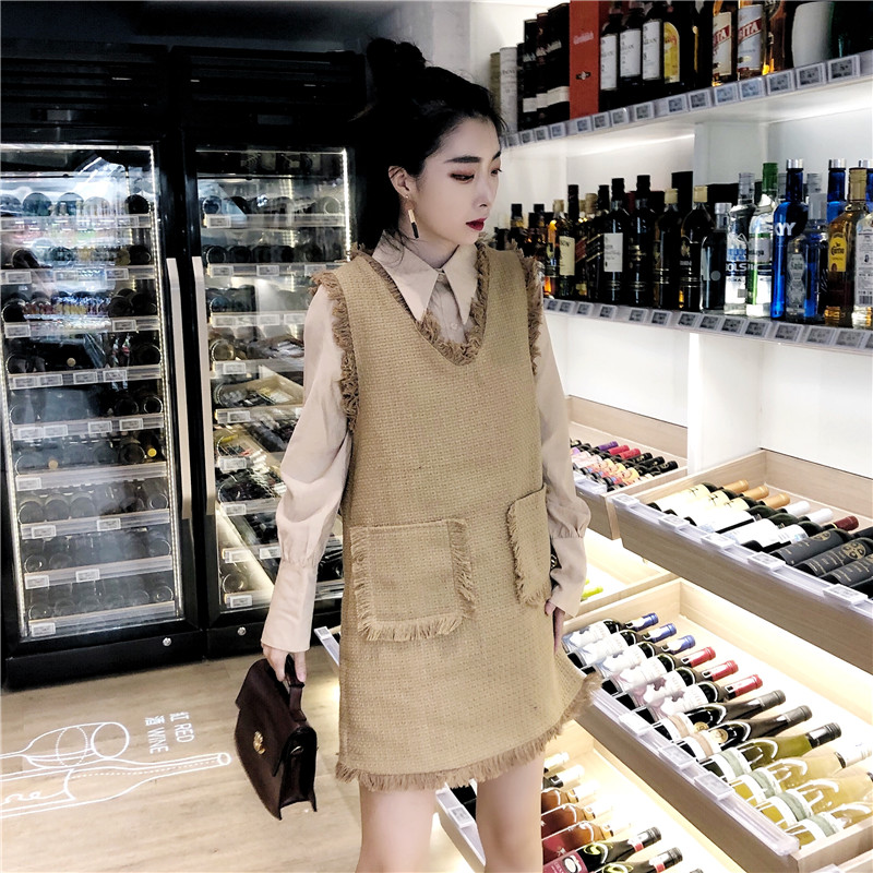 秋裝小香風粗花呢中長款V領馬甲背心裙小翻領純色襯衫女時尚套裝