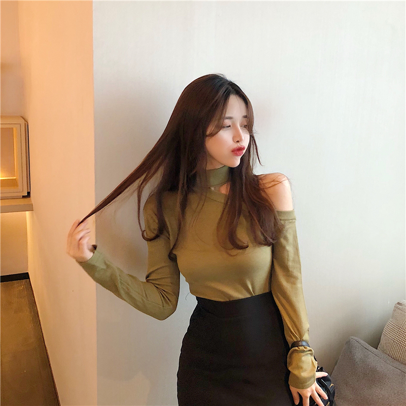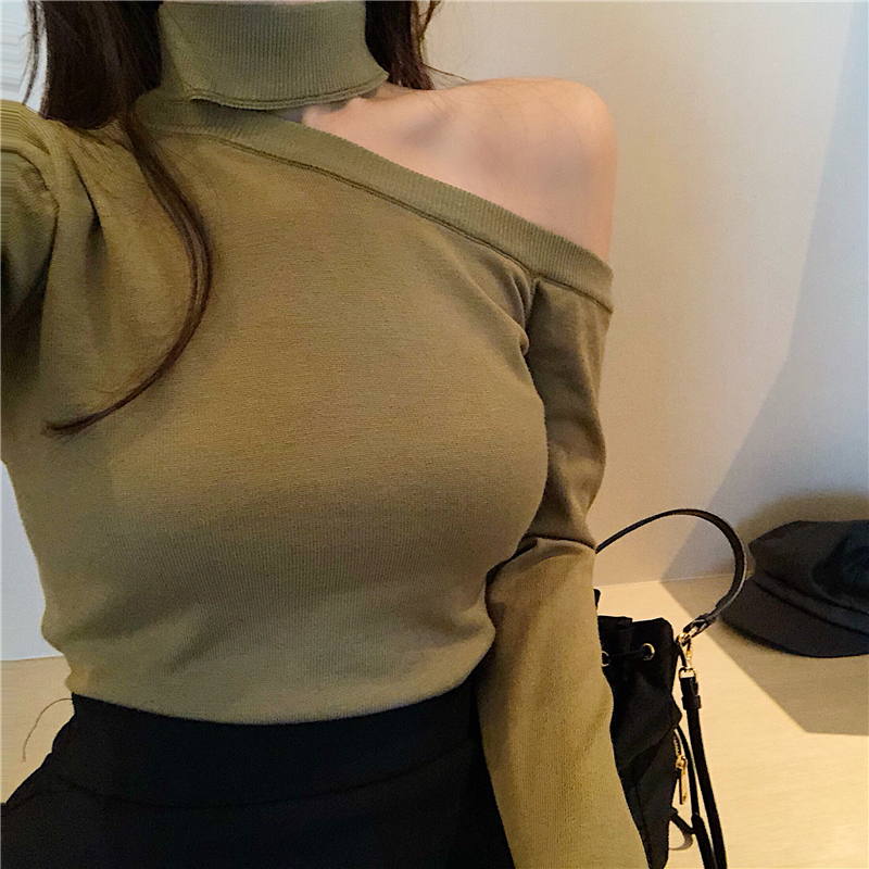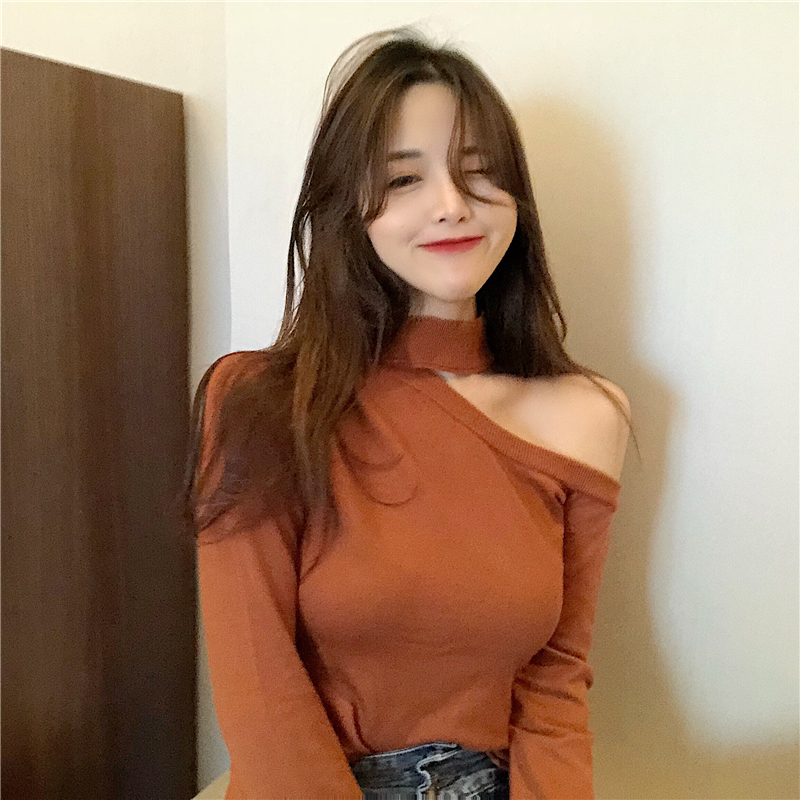 / chic早秋新款上衣女裝修身顯瘦韓風百搭單肩露肩打底毛衣針織衫潮