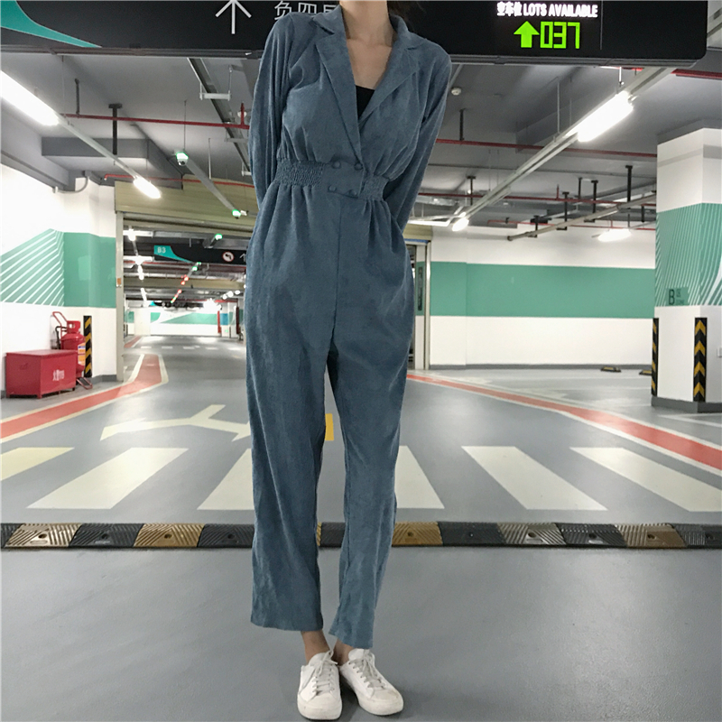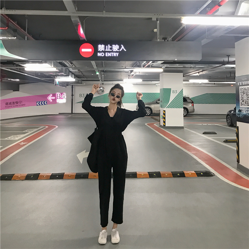 / 2018港風新款復古慵懶休閑氣質高腰顯瘦時尚直筒純色連衣褲女潮流