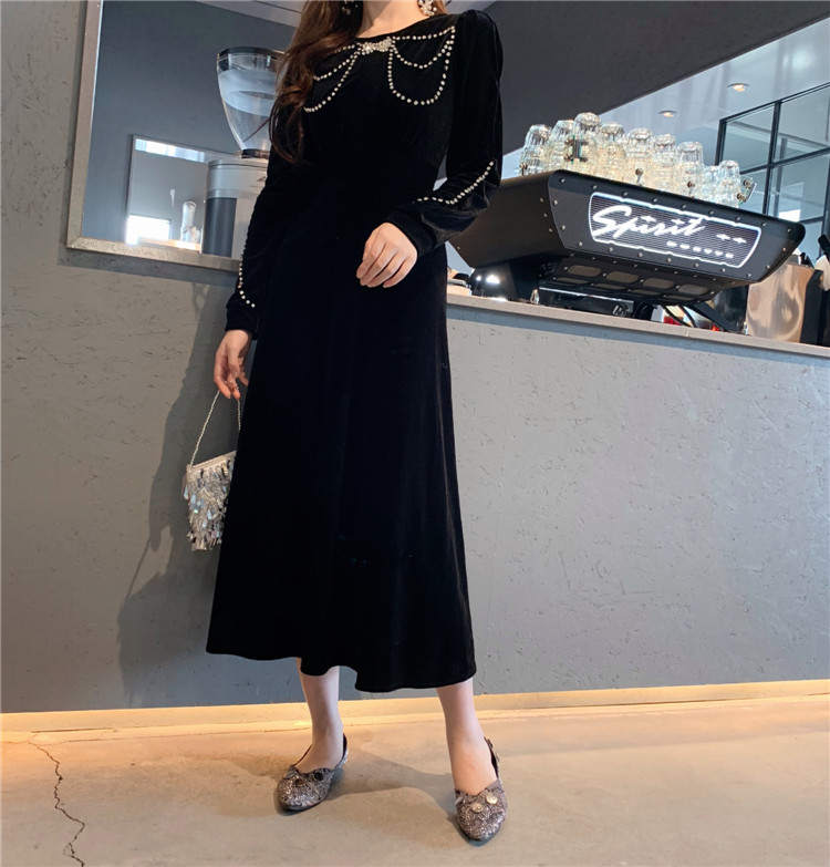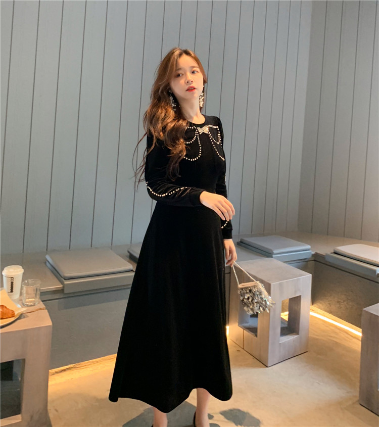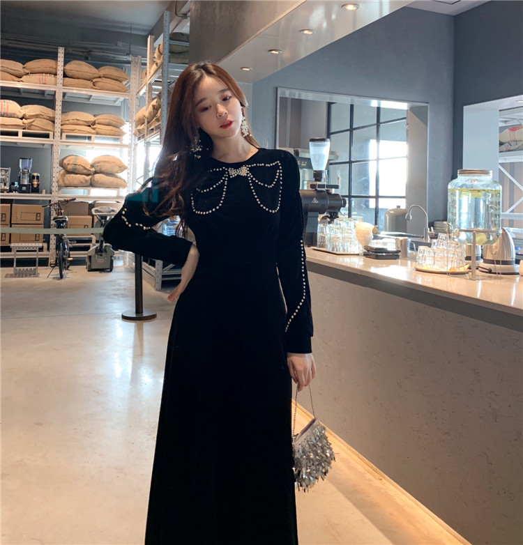 歡 2018秋冬內搭打底時尚小珍珠帶鉆高腰絲絨蝴蝶結圖案連衣裙