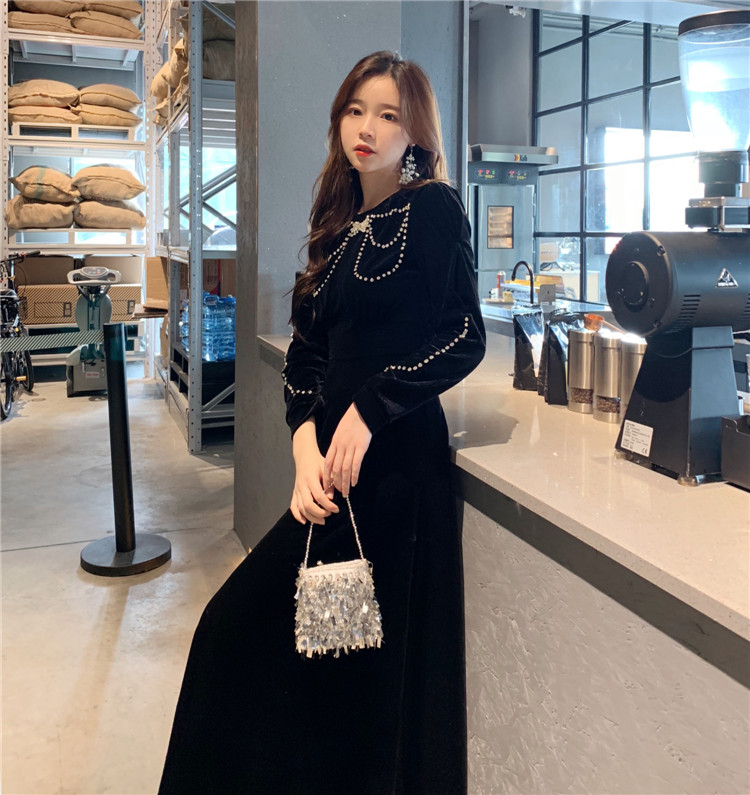 / 歡 2018秋冬內搭打底時尚小珍珠帶鉆高腰絲絨蝴蝶結圖案連衣裙