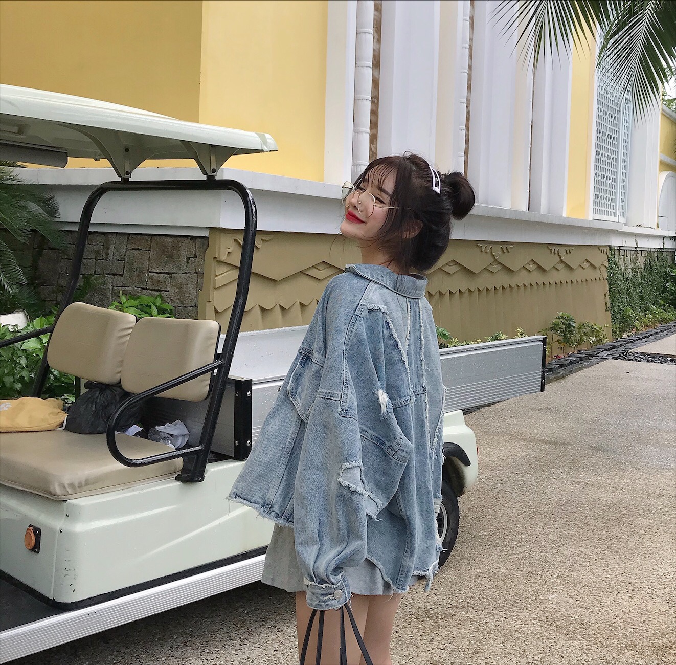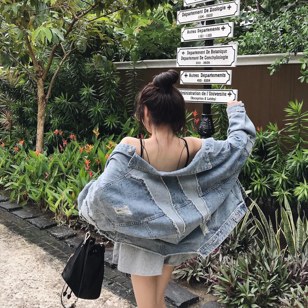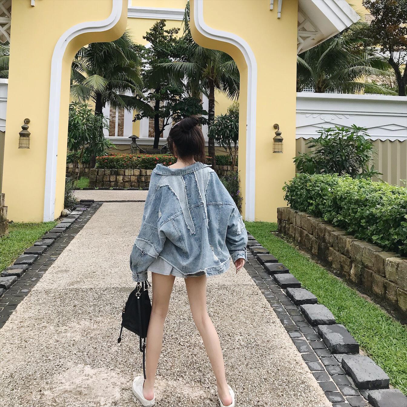 / 2018春秋款歐美寬松破洞剪邊做舊牛仔衣百搭短款拼接牛仔外套女潮