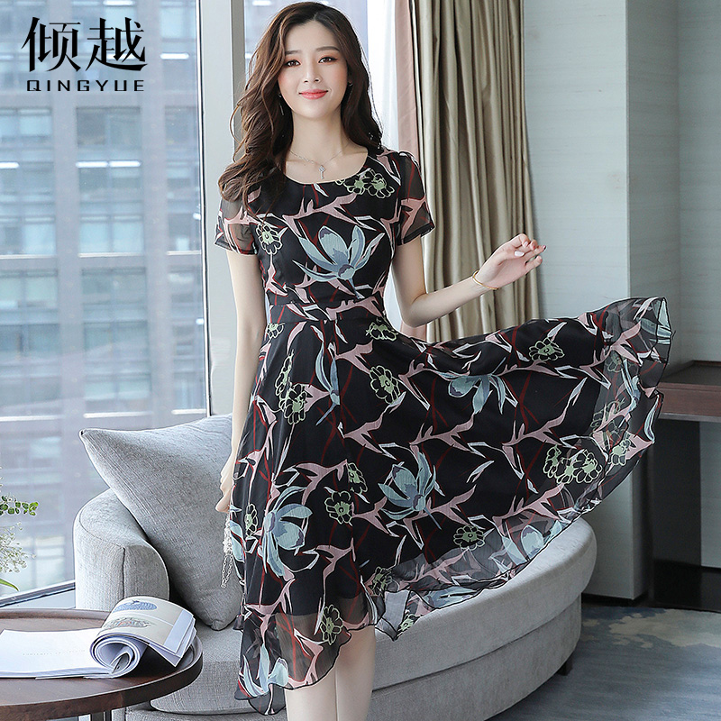 2017新款夏季長裙氣質印花淑女短袖雪紡連衣裙顯瘦韓版中長款裙子