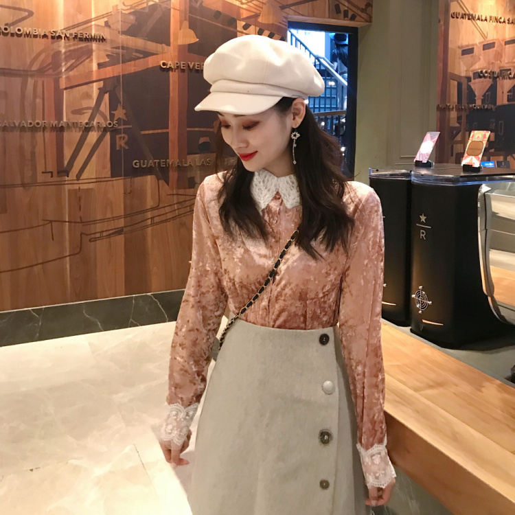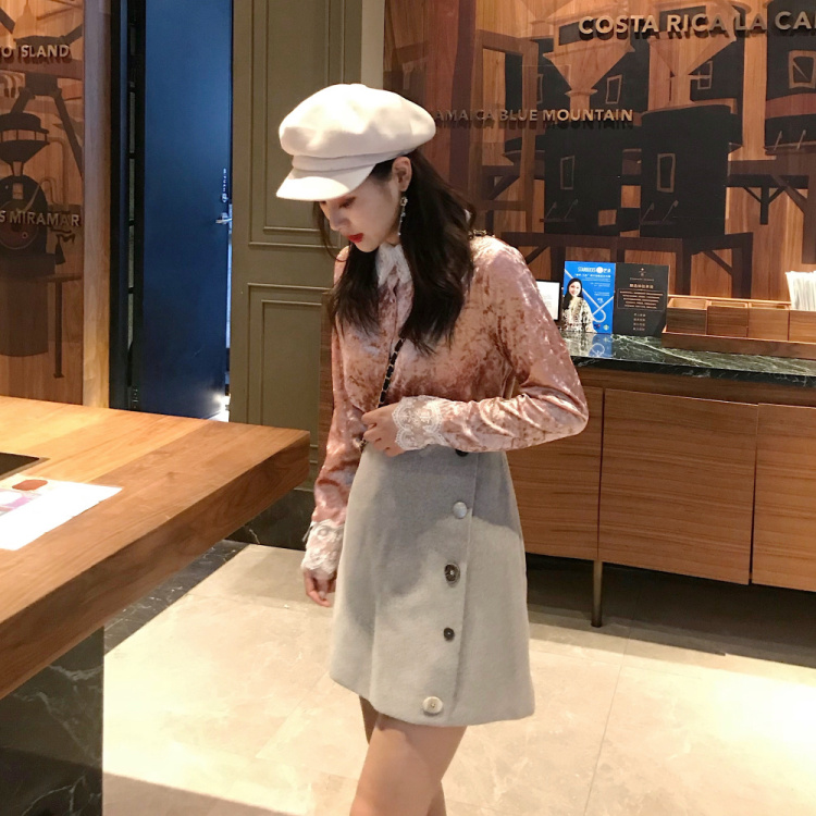 / 新款韓版花邊領襯衫上衣修身顯瘦排扣短款A字裙高腰半裙時尚套裝
