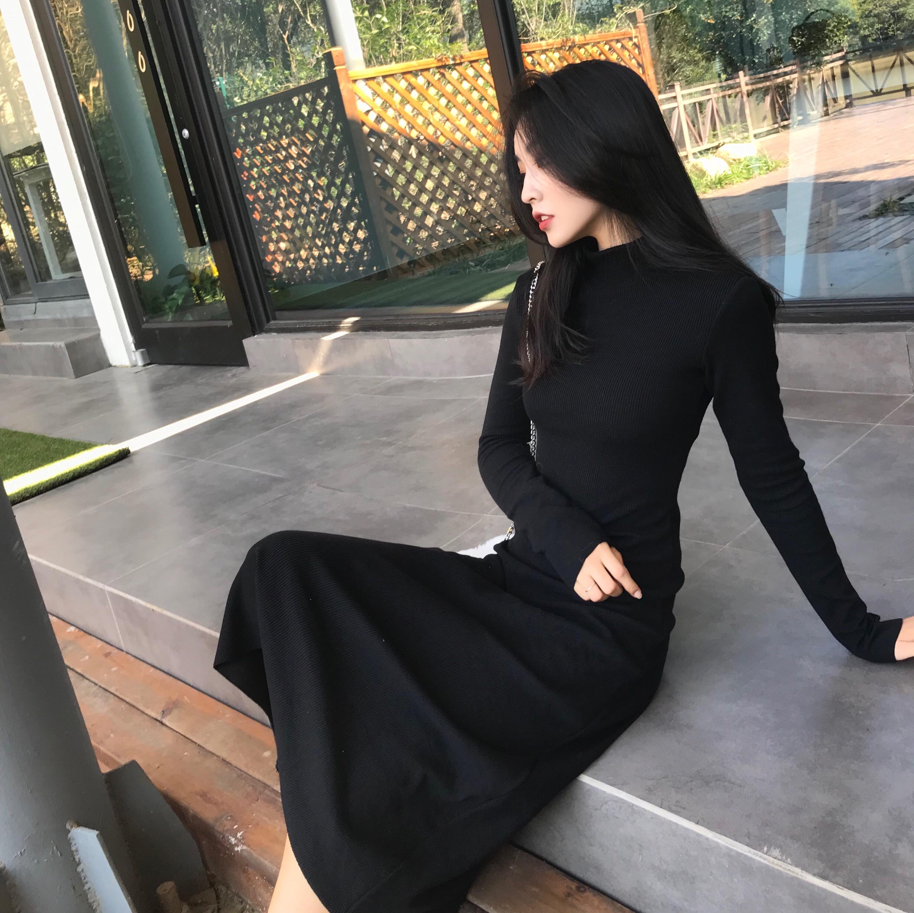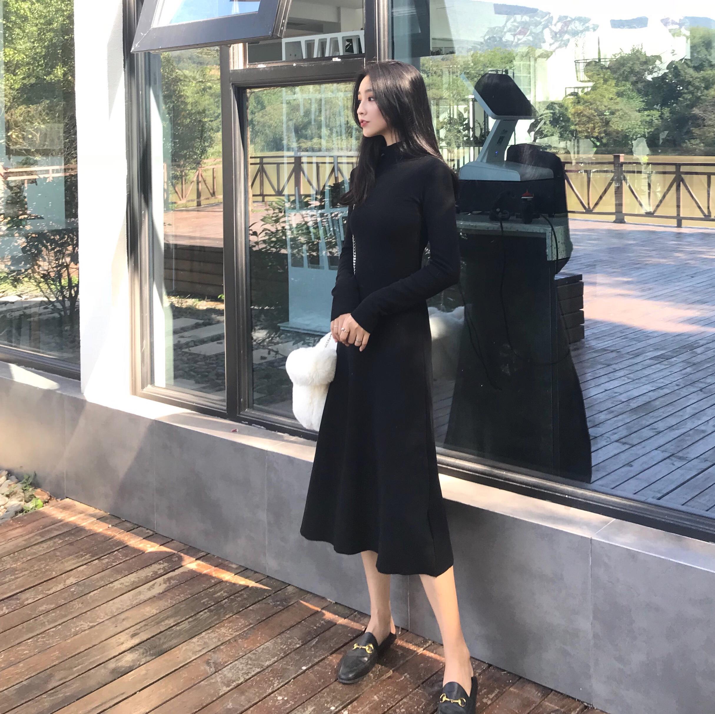 / 秋季女2018新款衣修身顯瘦修身純色百搭溫柔長袖初戀裙復古連衣裙