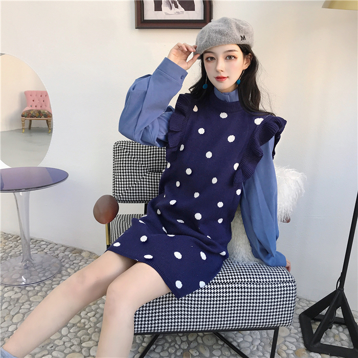 / 長袖寬松顯瘦打底衫木耳邊波點加厚針織背心裙秋冬時尚套裝兩件套