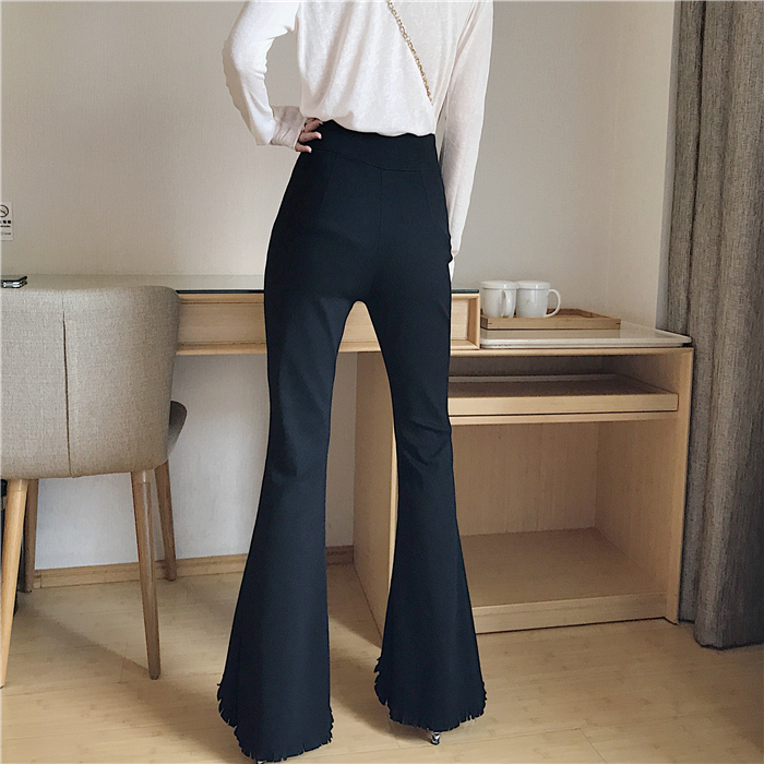 2018秋新款開叉流蘇時尚設計感褲子女氣質高腰彈力百搭修身喇叭褲
