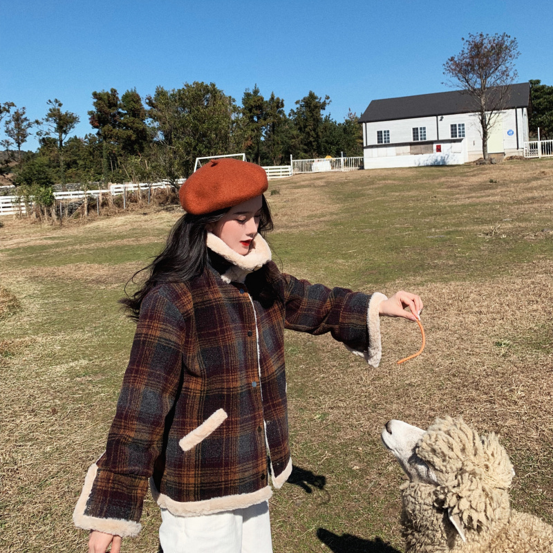 / 新款韓版冬季時尚學生加厚復古chic保暖加絨毛呢子格子短款外套女
