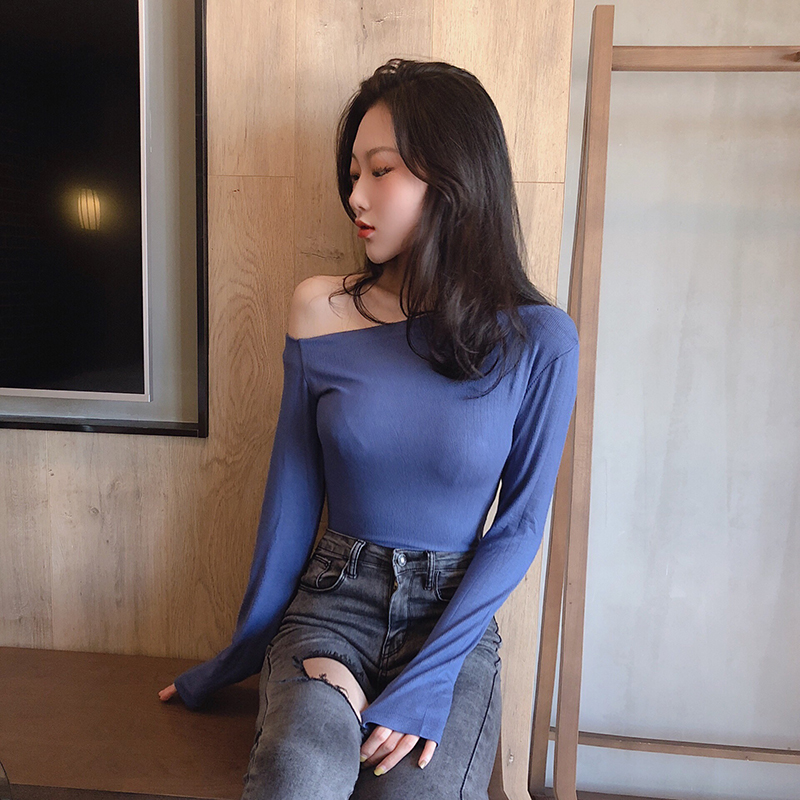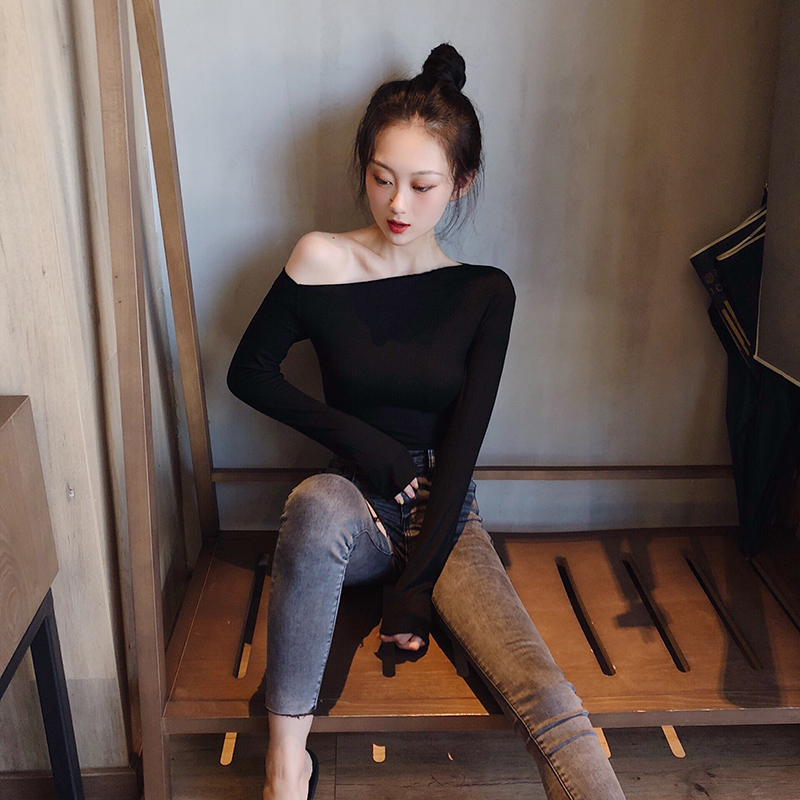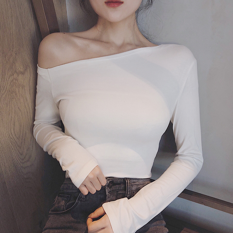 / 2018秋裝新款韓版百搭純色顯瘦露肩修身時尚chic女打底上衣T恤潮