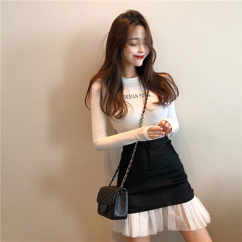 / 早秋新款修身顯瘦彈力長袖T恤女字母印花復古chic風百搭打底上衣