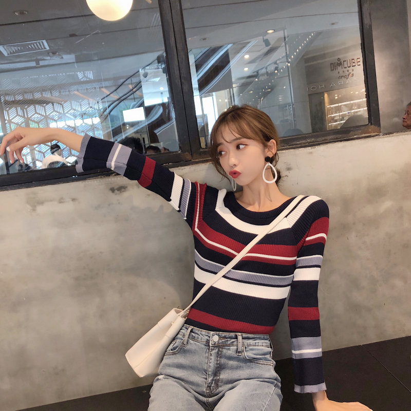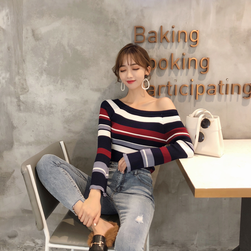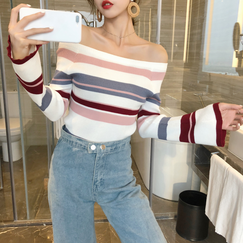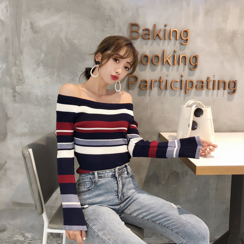 / 2018秋季港風時尚新款修身一字領露肩兩穿喇叭袖百搭針織衫女上衣