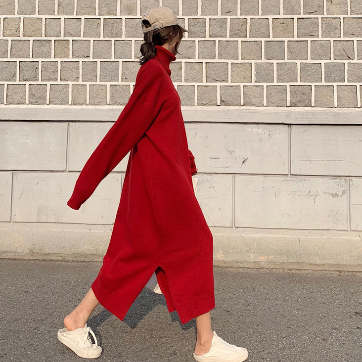 慵懶風套頭毛衣女2018新款秋冬韓版長款純色修身氣質開叉連衣裙女