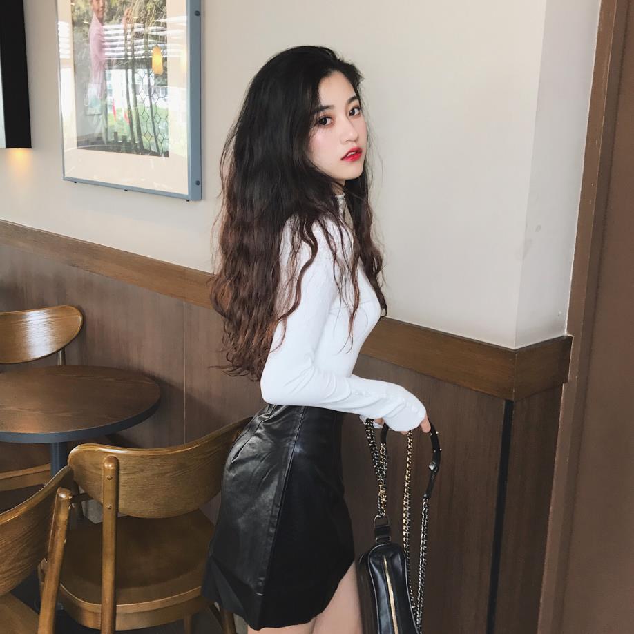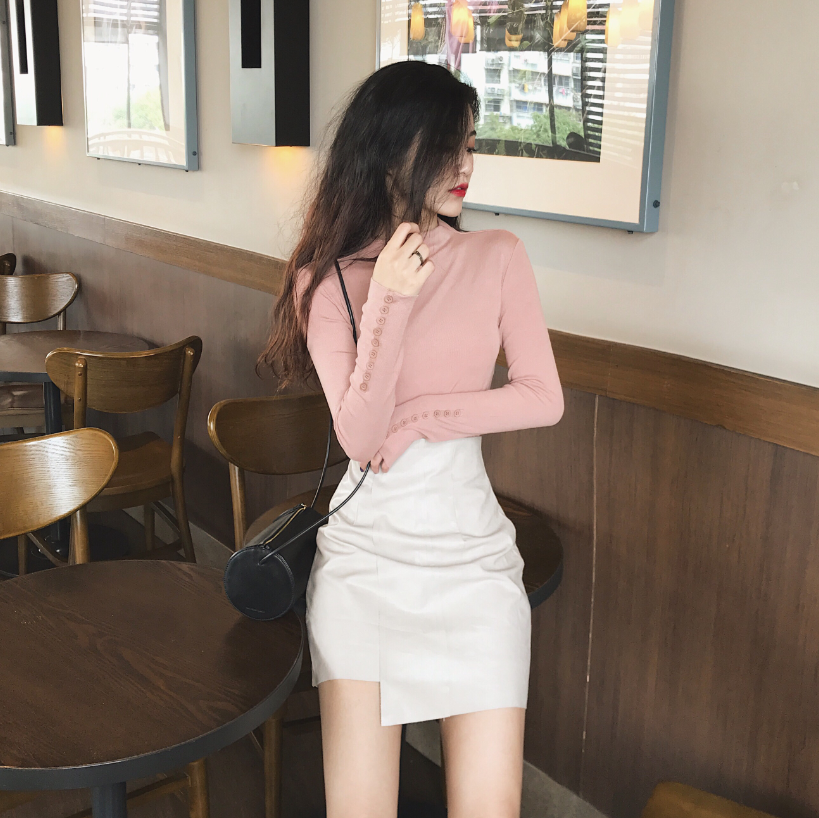 / 新款小立領修身扣子裝飾打底衫正反兩穿不規則高腰半身裙時尚套裝