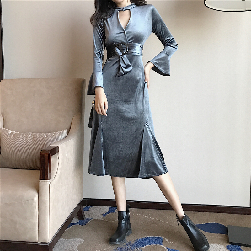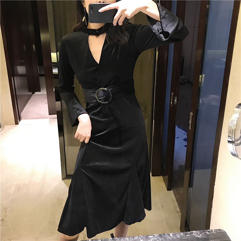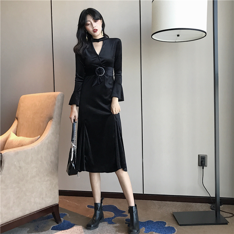 新款韓版chic秋季百搭顯瘦鏤空V領掛脖綁帶收腰復古絲絨連衣裙女