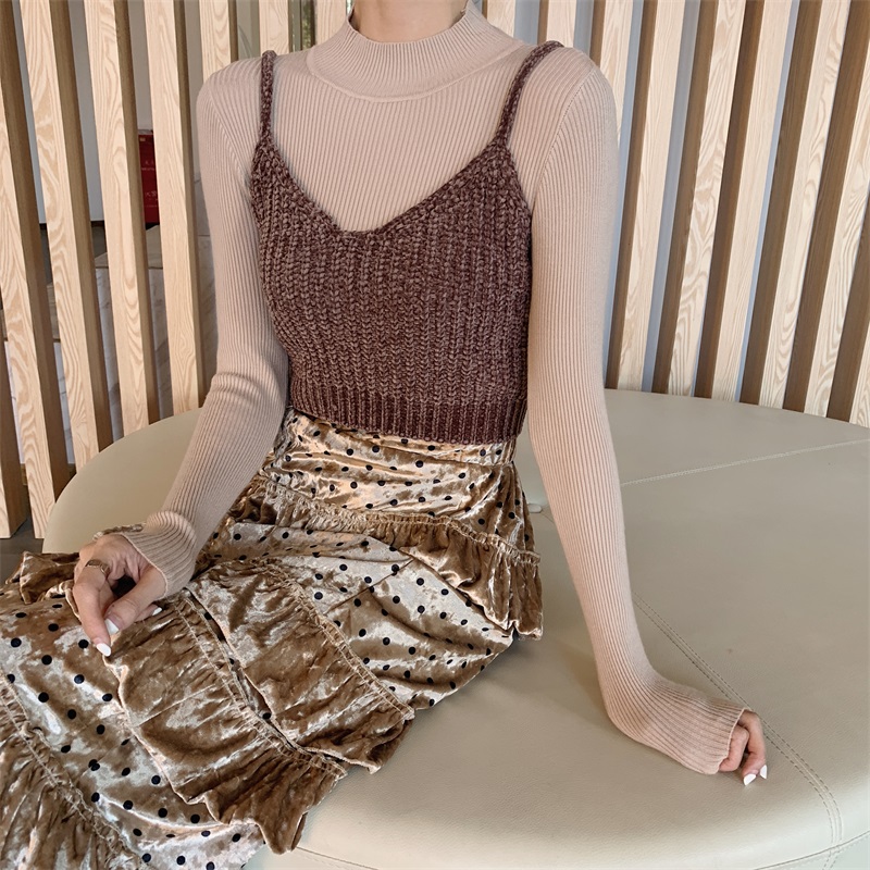韓版高腰荷葉邊A字裙后背綁帶針織吊帶針織打底衫三件套時尚套裝