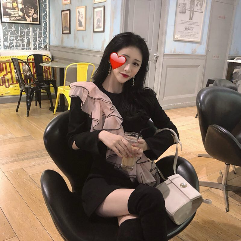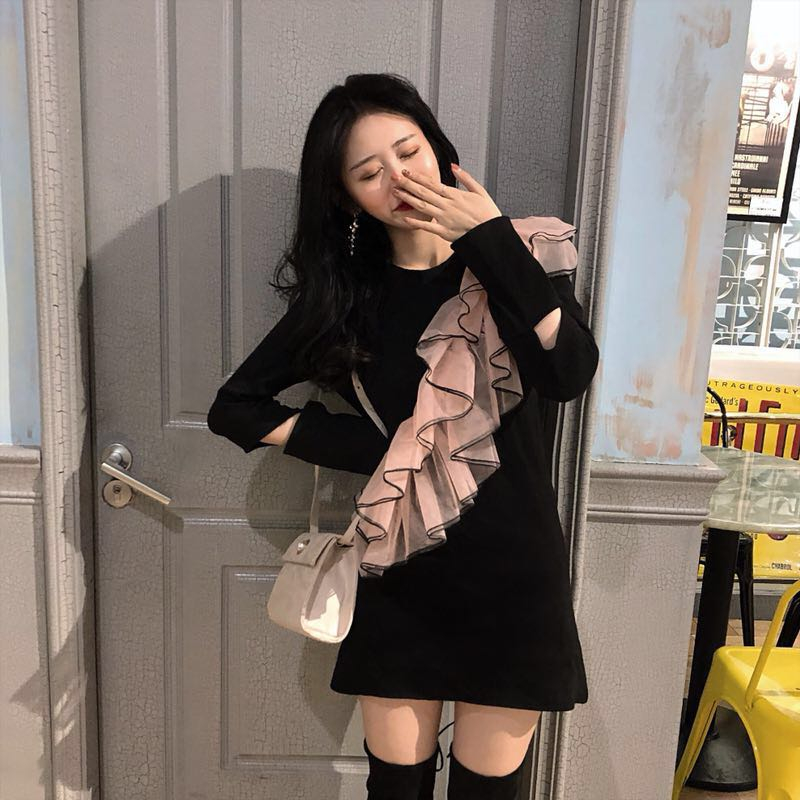 / 2018秋新品立體荷葉邊設計感時尚chic百搭復古拼接顯瘦短款連衣裙
