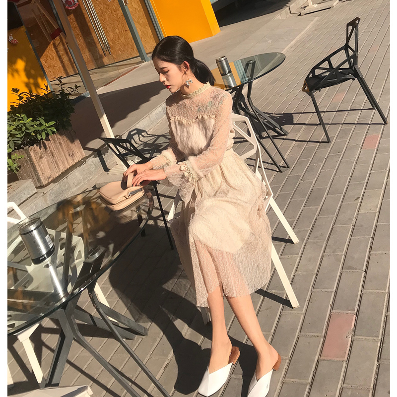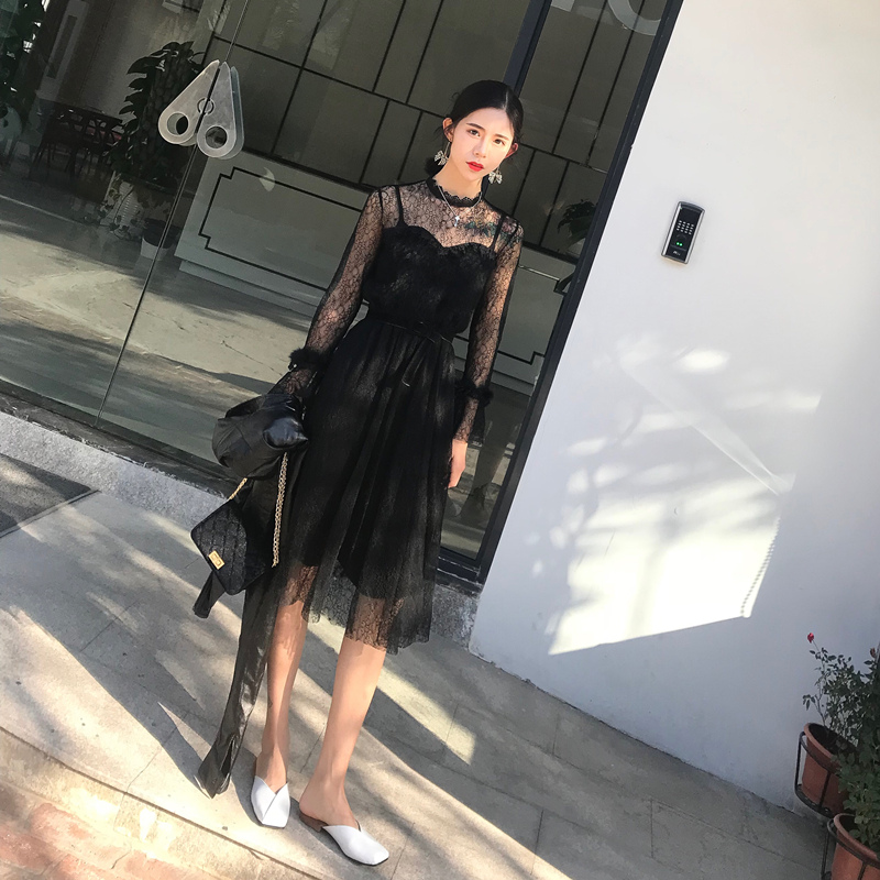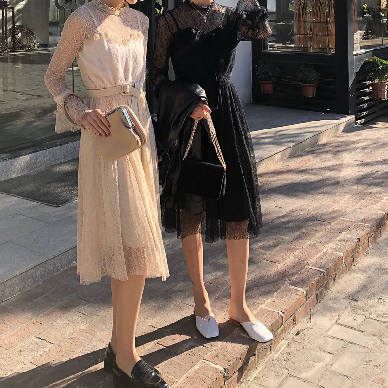 / 晚晚風時尚氣質百搭拼接毛喇叭袖收腰中長款蕾絲裙連衣裙女配腰帶