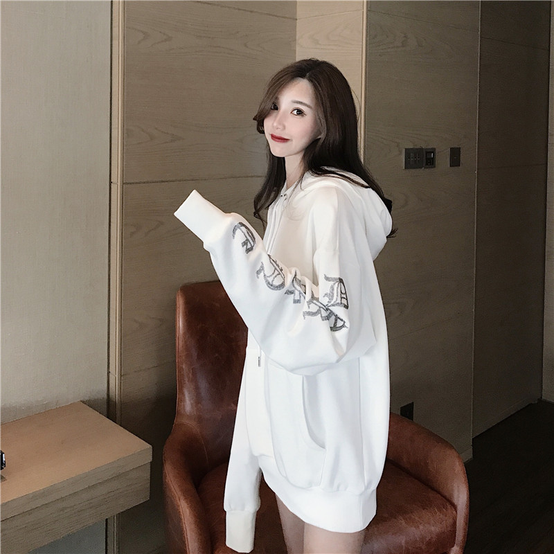/ 小清新時尚新款哥特字母亮片圓領抽繩ovresize加絨連帽衛衣外套女
