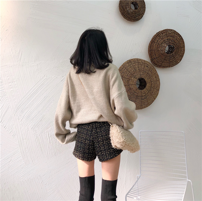 / 褲子新款韓版百搭pu皮拼接格子粗花呢短褲女時尚加絨寬松闊腿褲潮