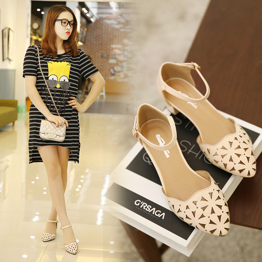 / 夏季鏤空透氣女鞋尖頭粗跟包頭新款中跟一字搭扣中空女士涼鞋