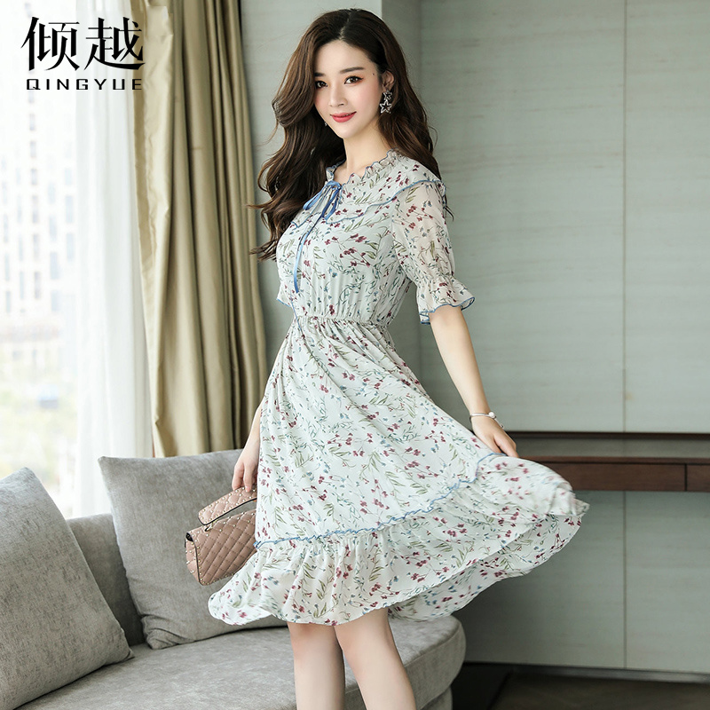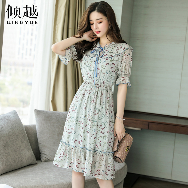 / 印花雪紡連衣裙2017夏季新款女裝韓版短袖大擺魚尾裙碎花打底裙潮