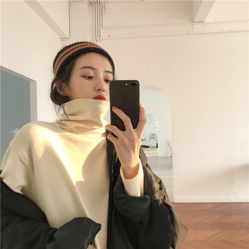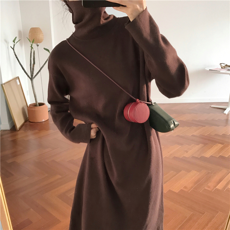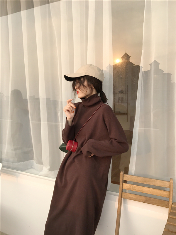 / 秋冬新款韓版慵懶百搭純色寬松高領長袖中長款打底針織毛衣連衣裙