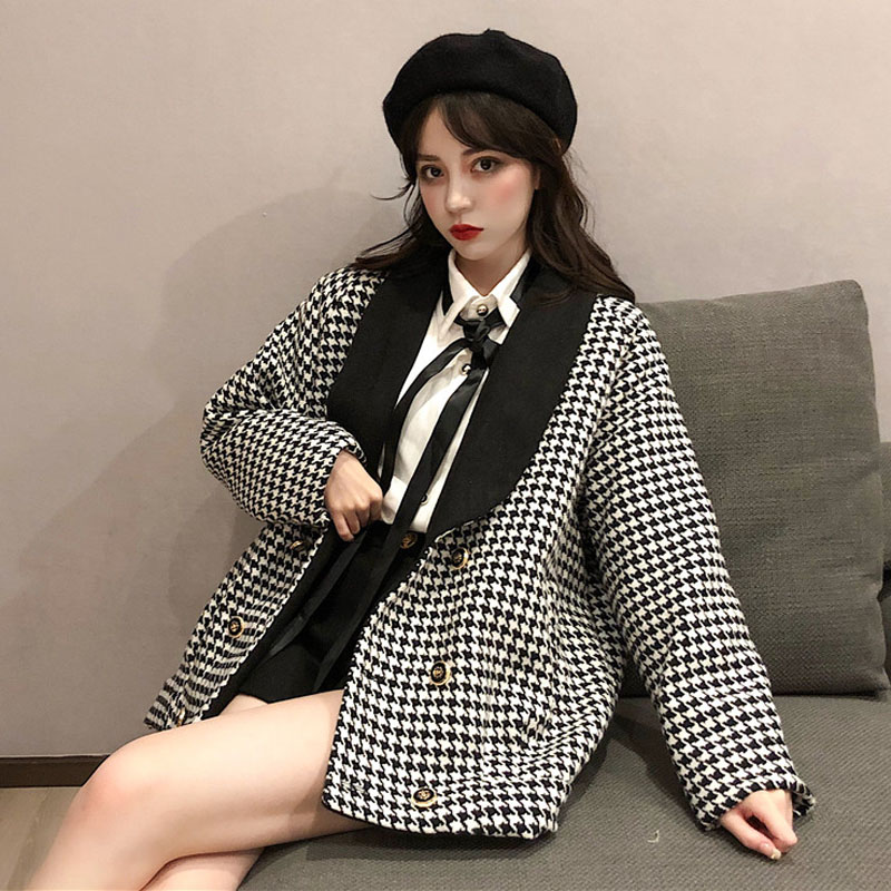 / 秋冬季新款斗篷千鳥格毛呢外套女+洋氣領帶襯衫+排扣呢子短褲套裝