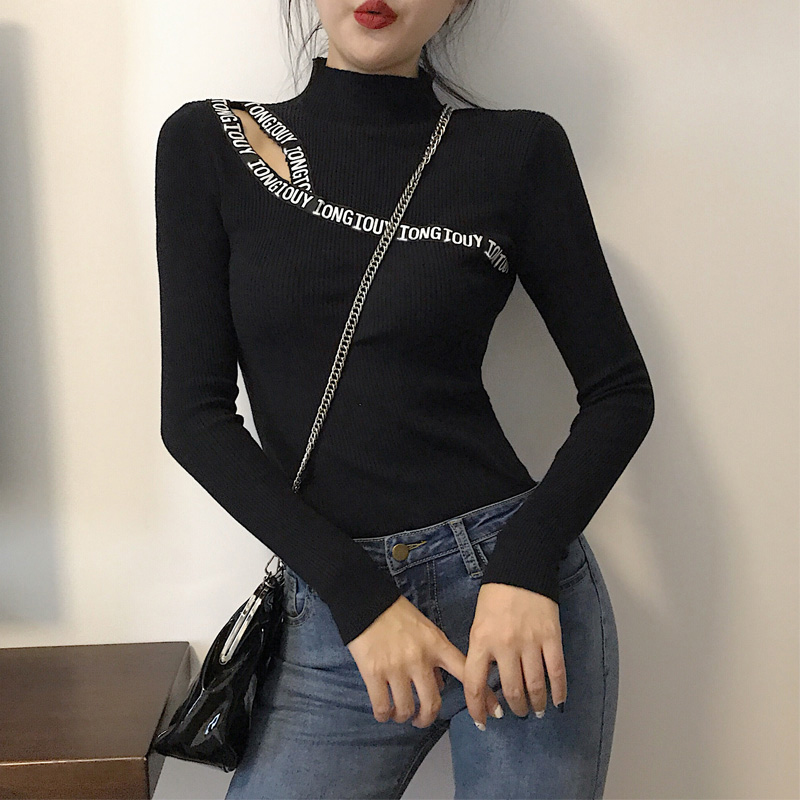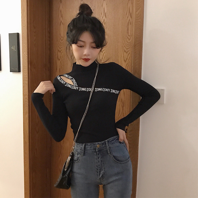 / chic上衣女秋季新款彈力2018時尚修身半高領漏肩長袖打底針織衫潮