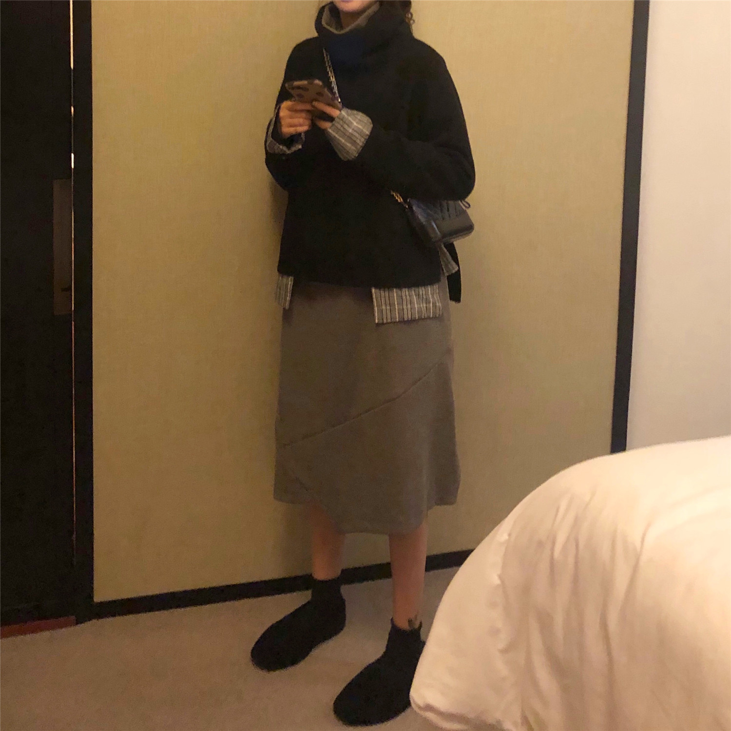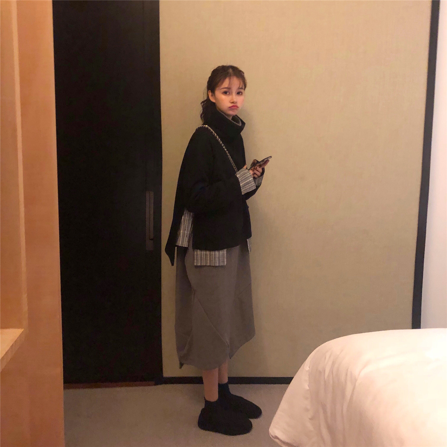 韓版慵懶風上衣高領拼接呢子外套女+寬松打底中長款連衣裙兩件套