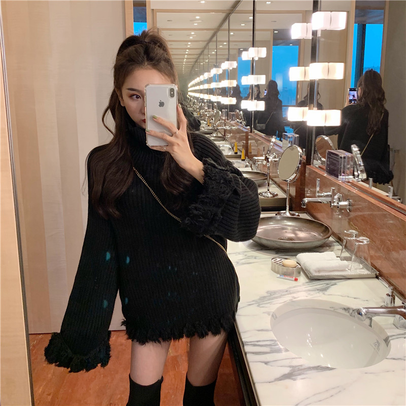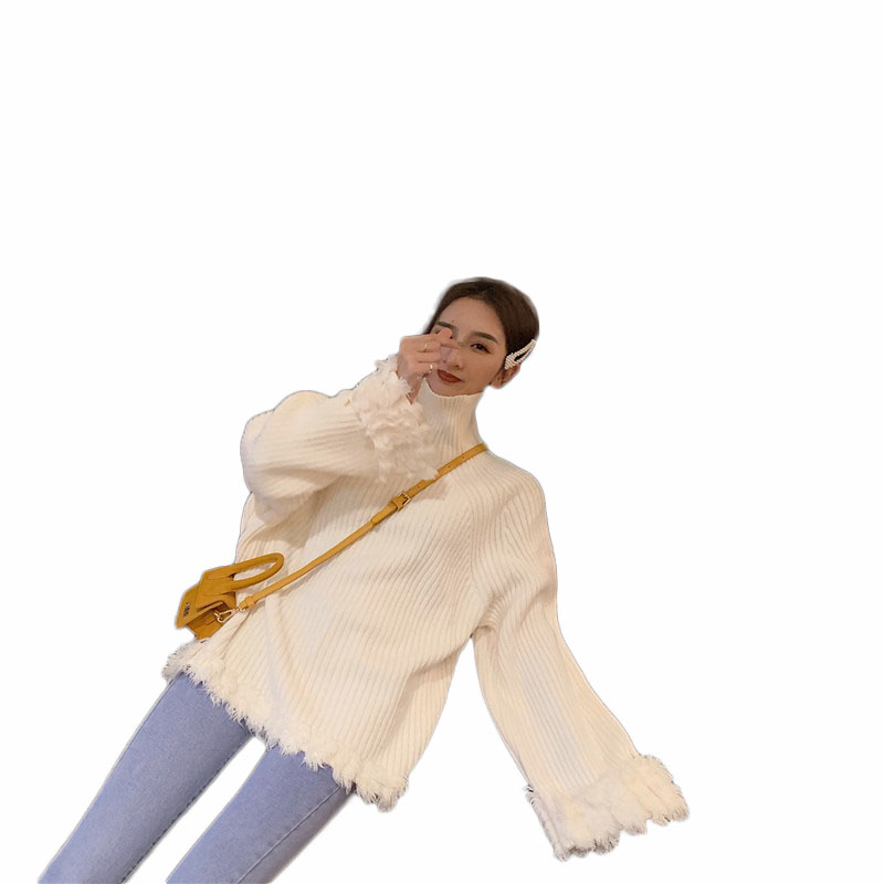 慵懶風套頭毛衣女2018新款秋冬韓版寬松百搭加厚高領拼接流蘇上衣
