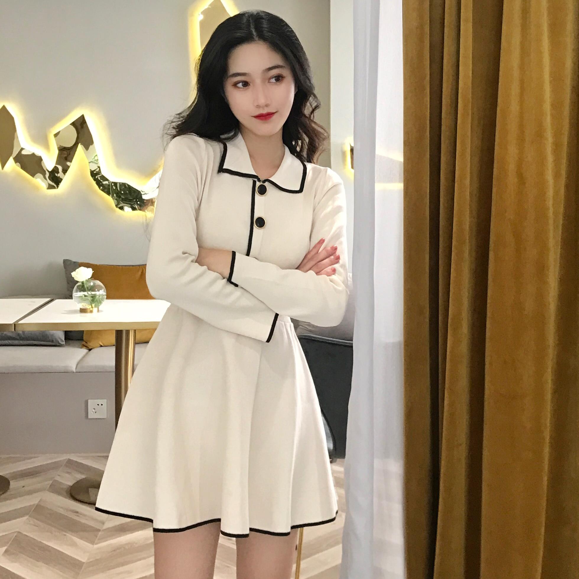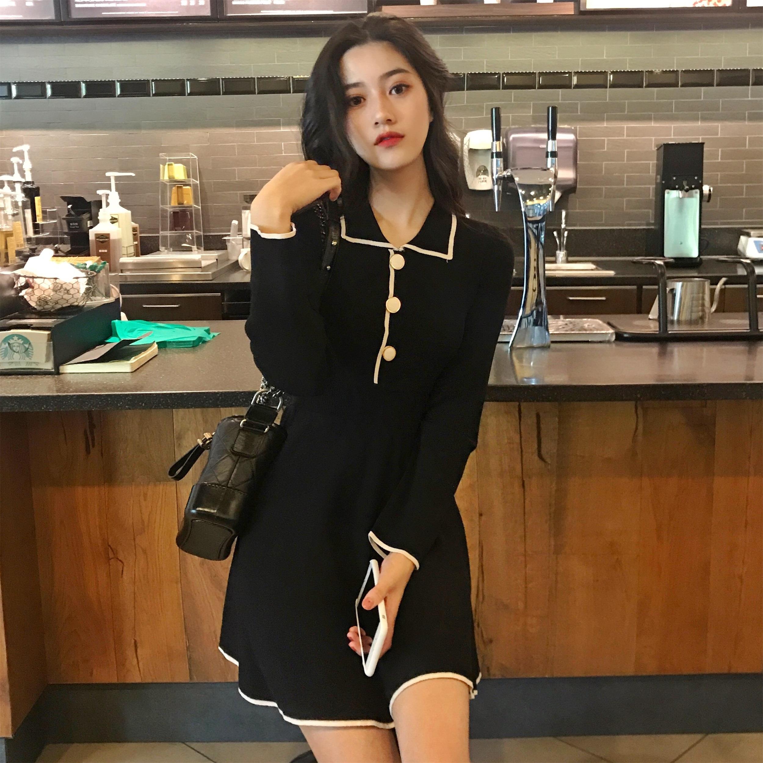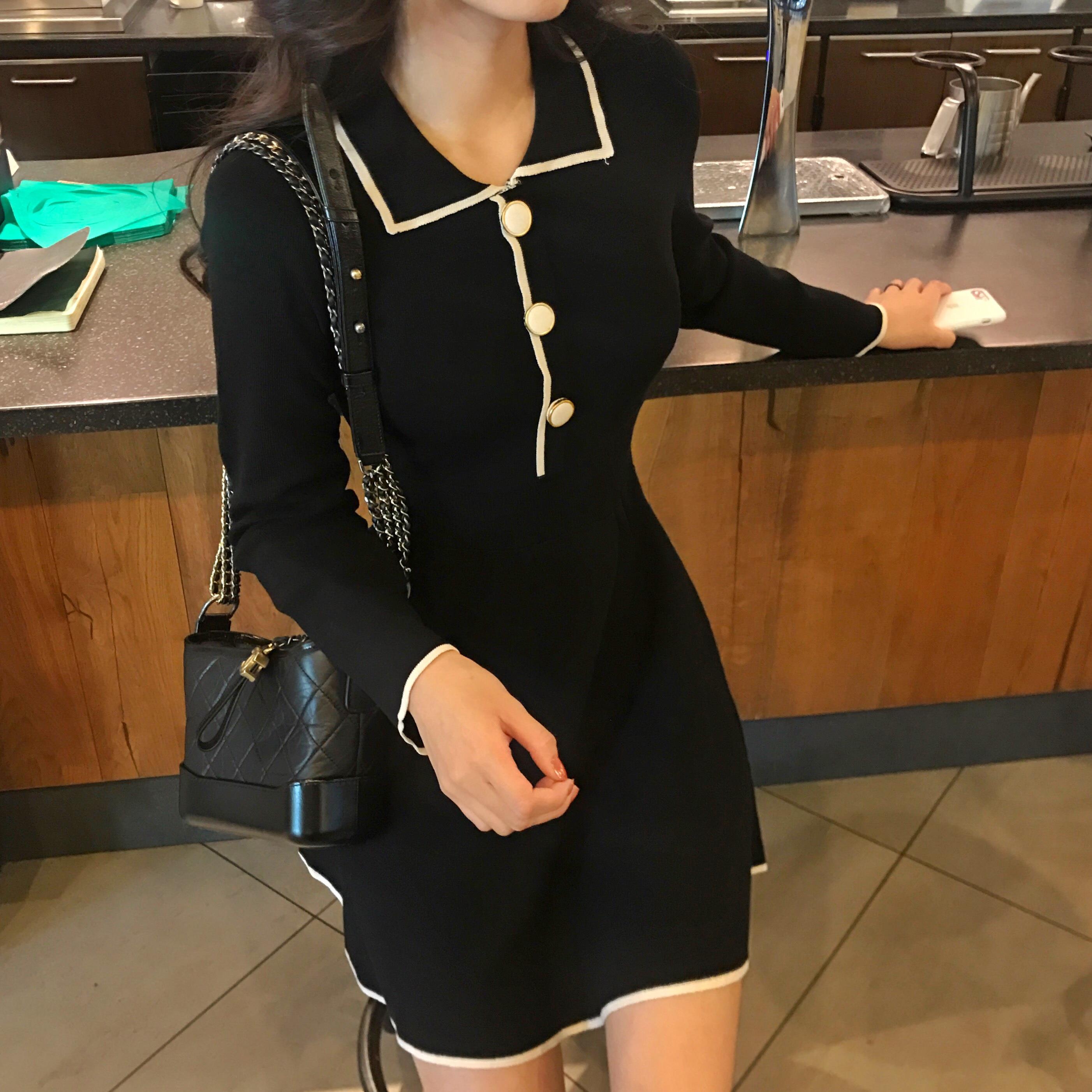 / 2018新款秋季韓版Chic氣質百搭修身顯瘦翻領高腰針織長袖連衣裙女
