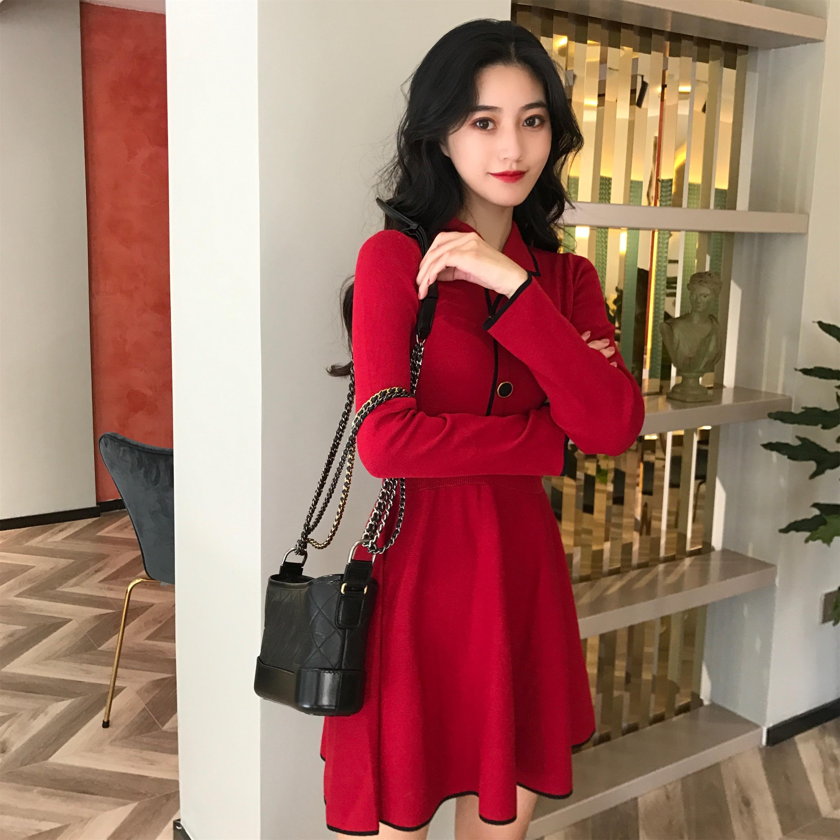 2018新款秋季韓版Chic氣質百搭修身顯瘦翻領高腰針織長袖連衣裙女