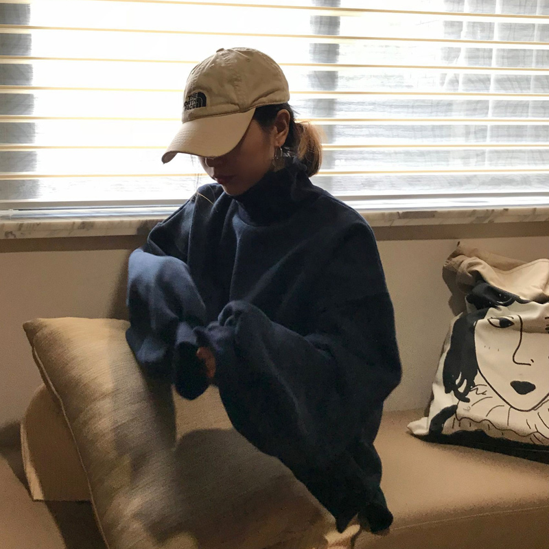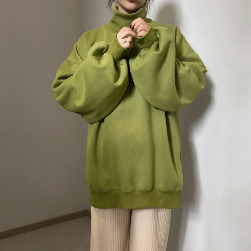 復古韓國chic牛油果綠高領燈籠袖加厚加絨保暖套頭衛衣女2018新款