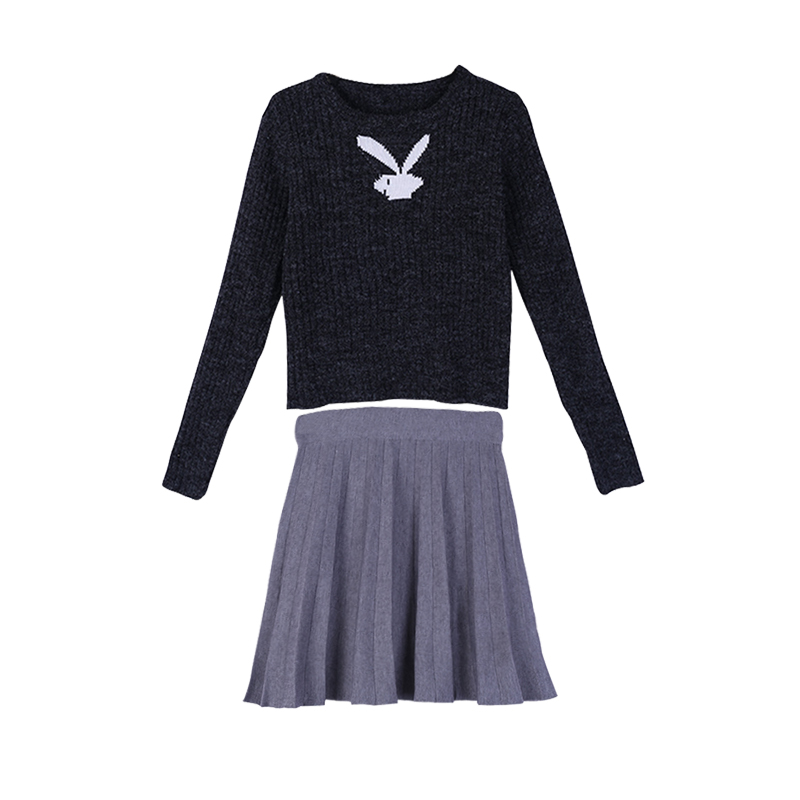 秋冬新款韓版顯瘦修身長袖毛線針織衫壓折高腰針織半身裙時尚套裝