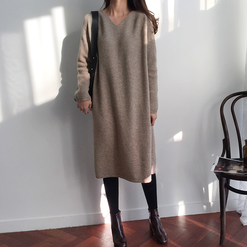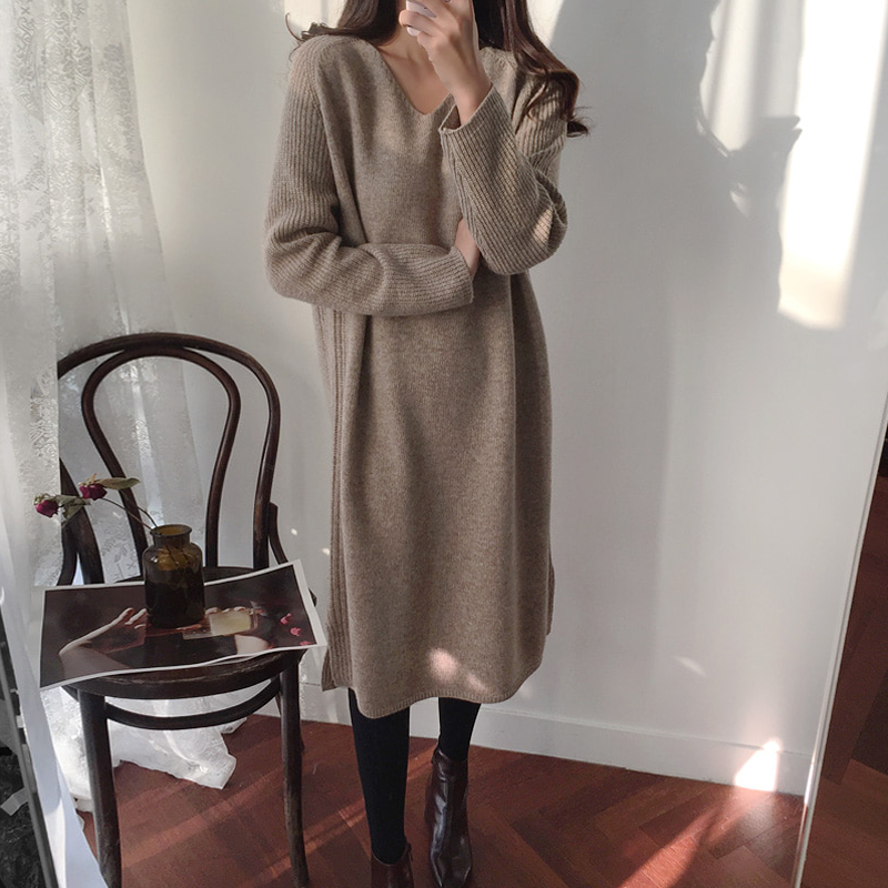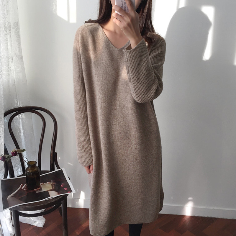 韓國chic秋冬2018新款氣質V領長袖中長款顯瘦毛線連衣裙女毛衣裙