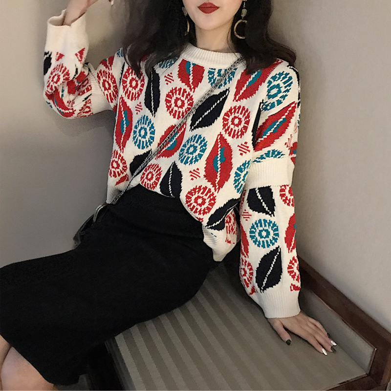 / 港味秋冬寬松慵懶民族風樹葉圖案新款毛衣女長袖套頭圓領chic上衣