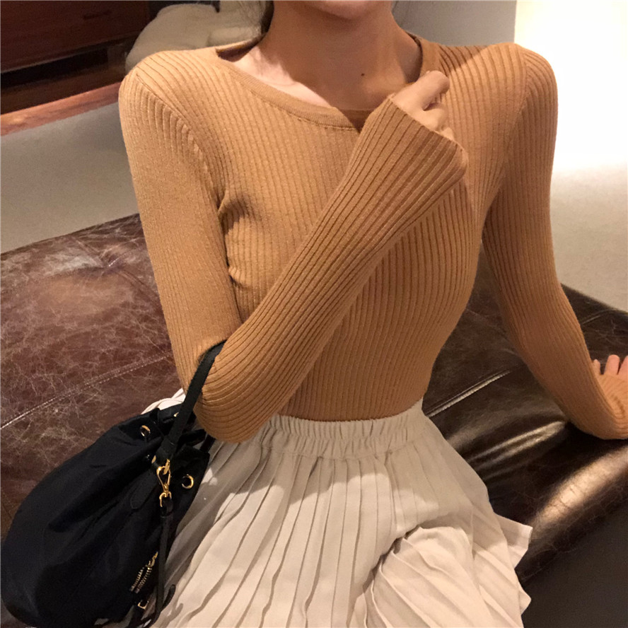 復古港味2018秋新款修身顯瘦百搭純色韓版針織長袖圓領打底衫上衣