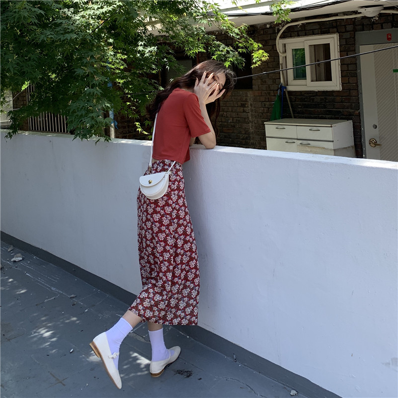 / 肉完港味簡約T恤+古著感少女雪紡半身碎花裙小清新甜美田園風套裝