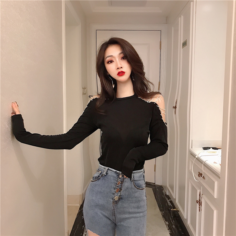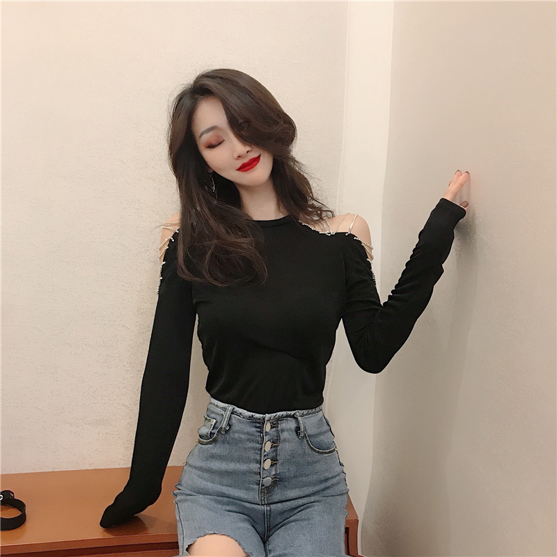 秋季新款chic港味復古小性感修身顯瘦氣質碎磚吊鏈露肩打底衫上衣
