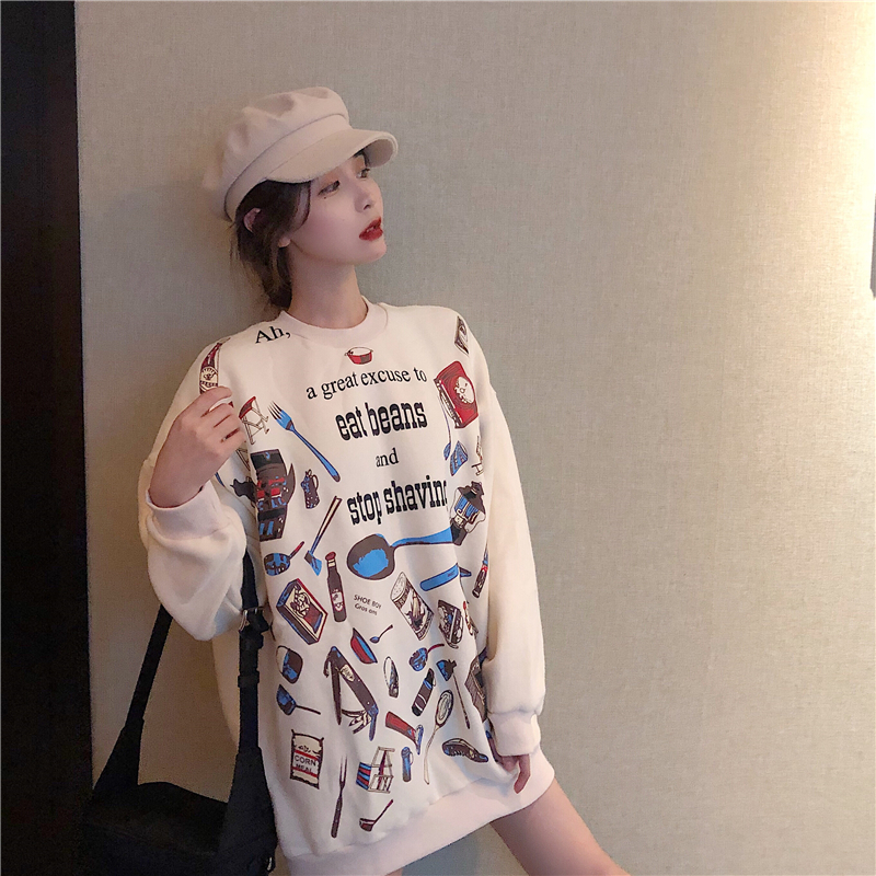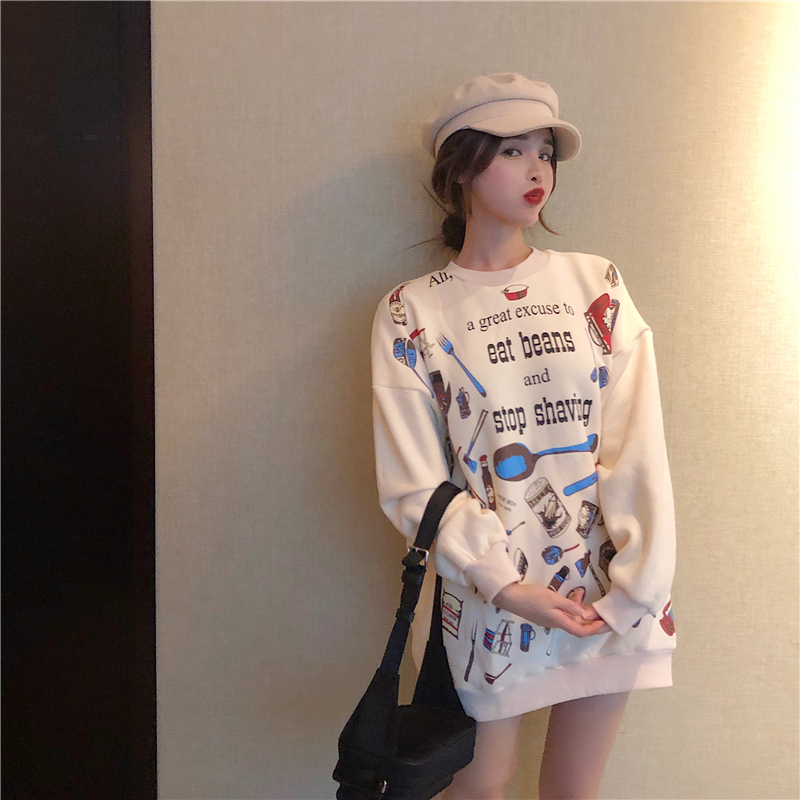 / 港風新款韓版百搭上衣寬松滿幅印花字母圖案圓領套頭加絨時尚衛衣