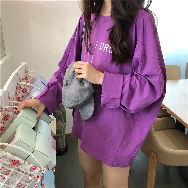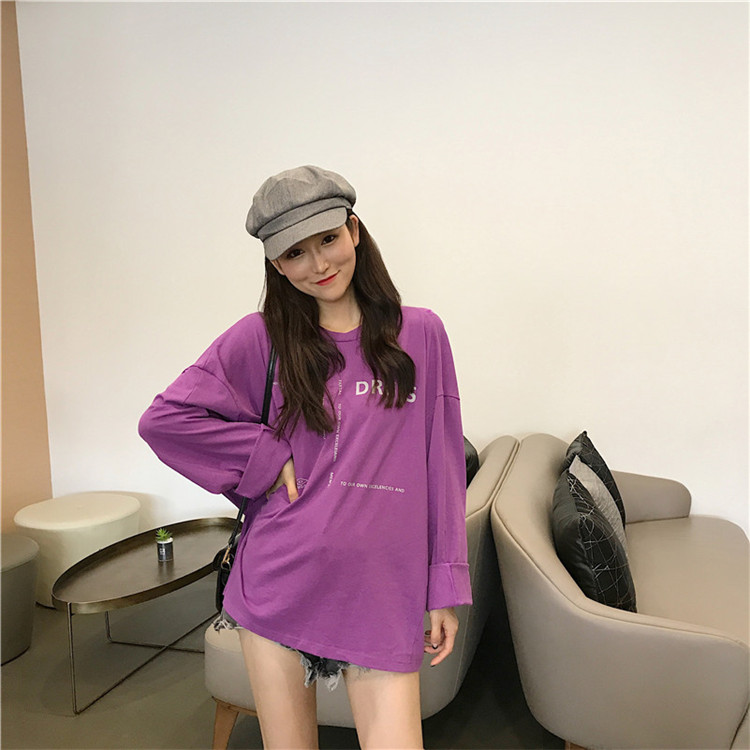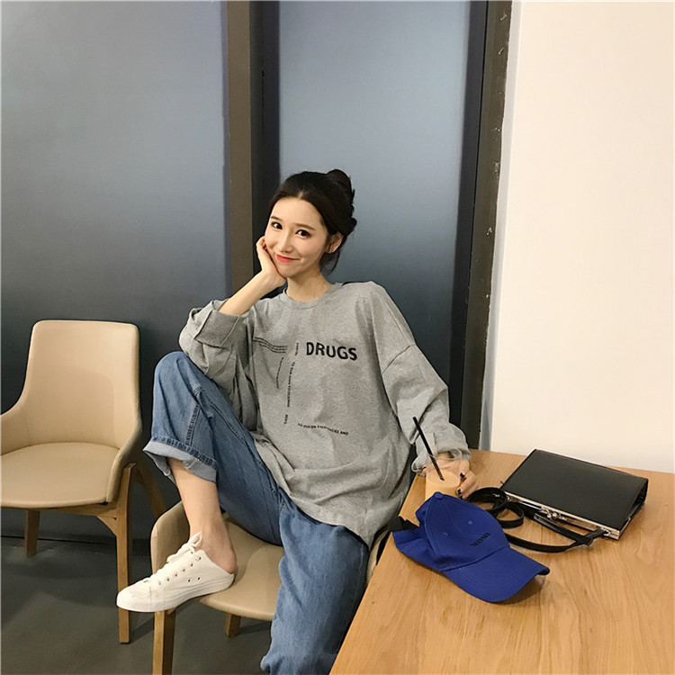 / chic早秋上衣女2018新款韓版百搭寬松顯瘦露背字母印花長袖T恤潮