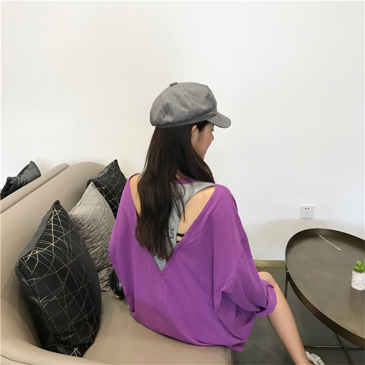 chic早秋上衣女2018新款韓版百搭寬松顯瘦露背字母印花長袖T恤潮