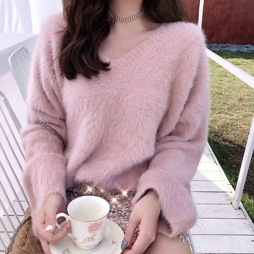 簡約慵懶風套頭毛衣女2018新款秋冬韓版加厚針織V領長袖貂絨上衣