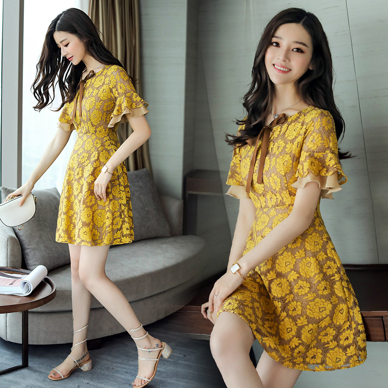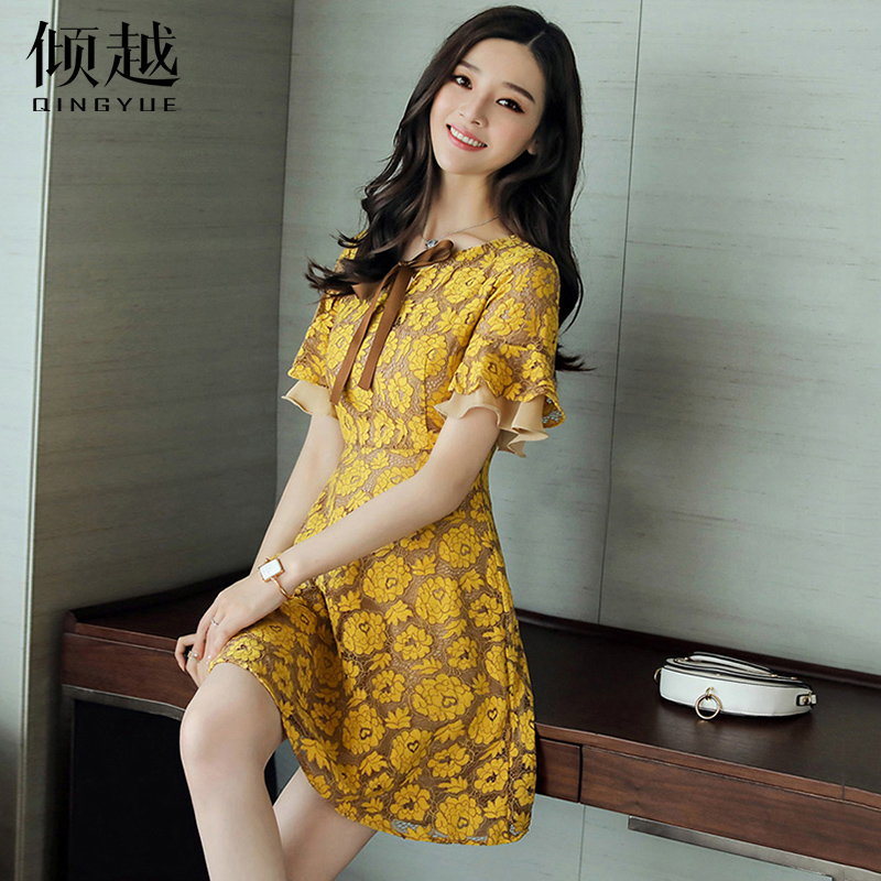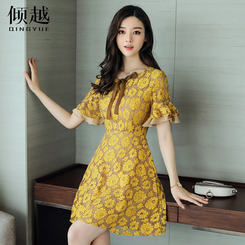 / 2017夏新款女雪紡碎花中長款連衣裙優雅氣質喇叭袖蝴蝶結印花裙子