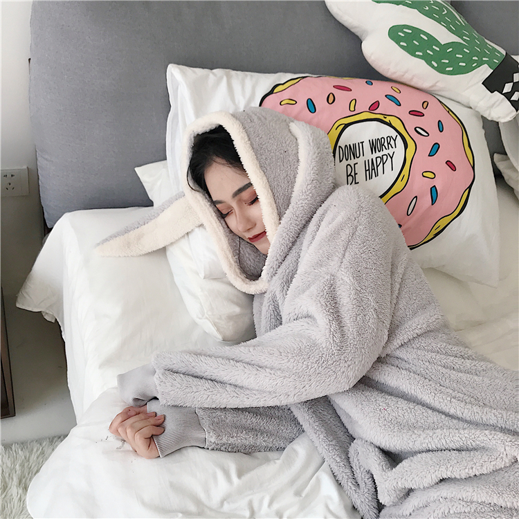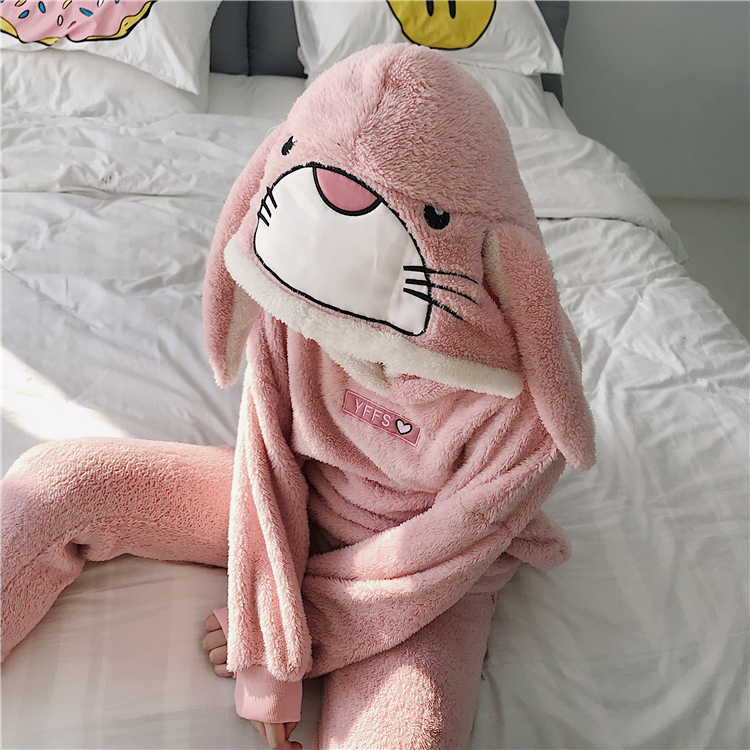 加絨加厚舒適珊瑚絨兔子耳朵睡衣新款可愛卡通連帽情侶家居服套裝