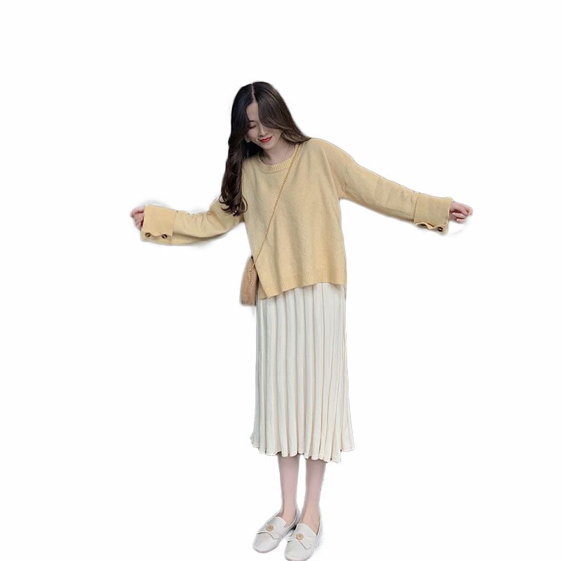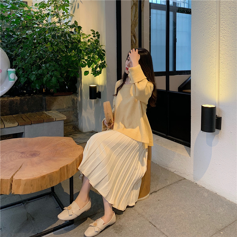 慵懶風寬松毛衣女套頭長袖針織衫上衣+中長款高腰百褶半身裙套裝