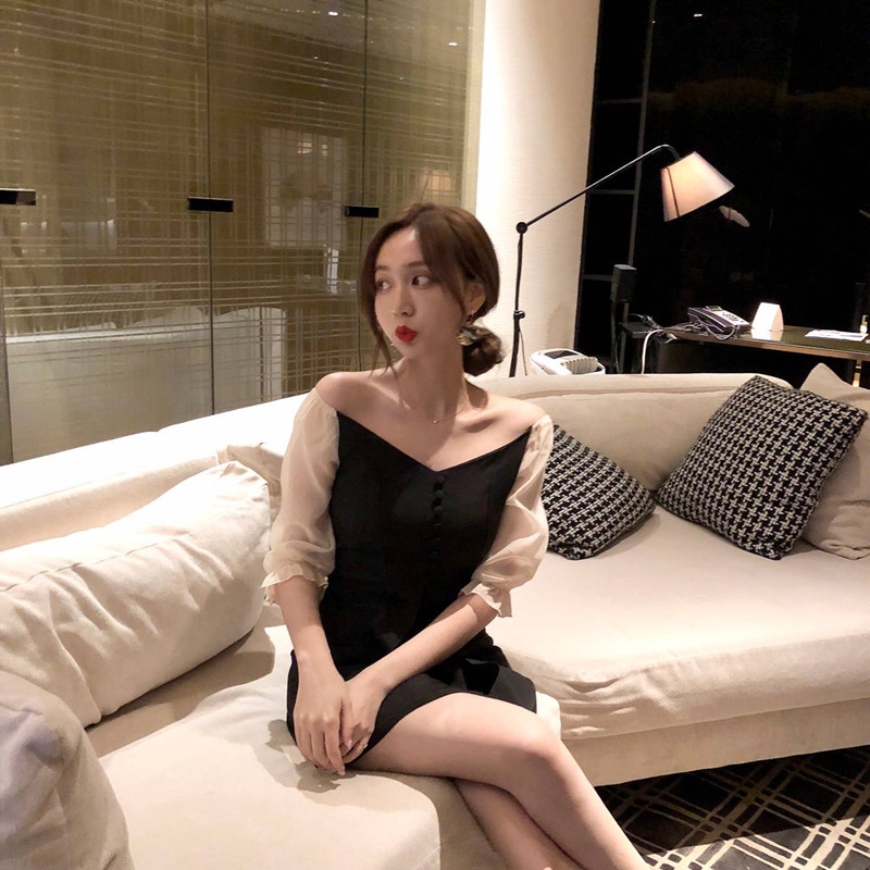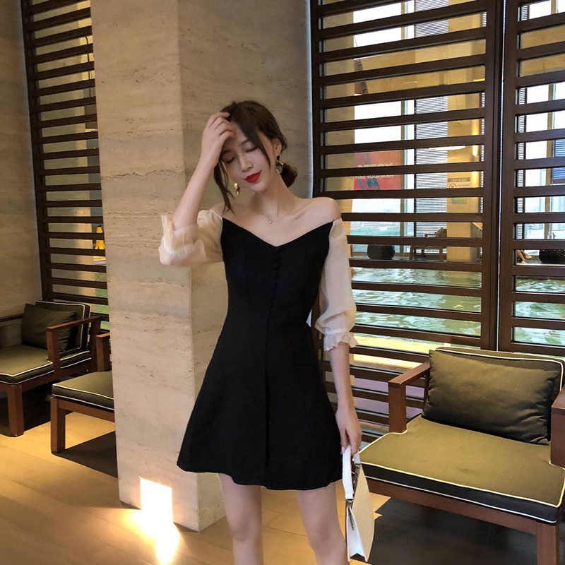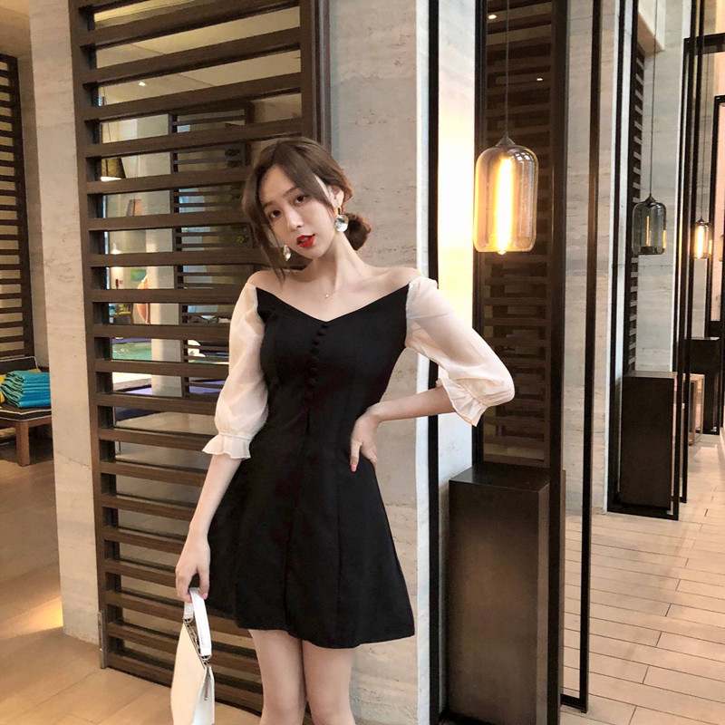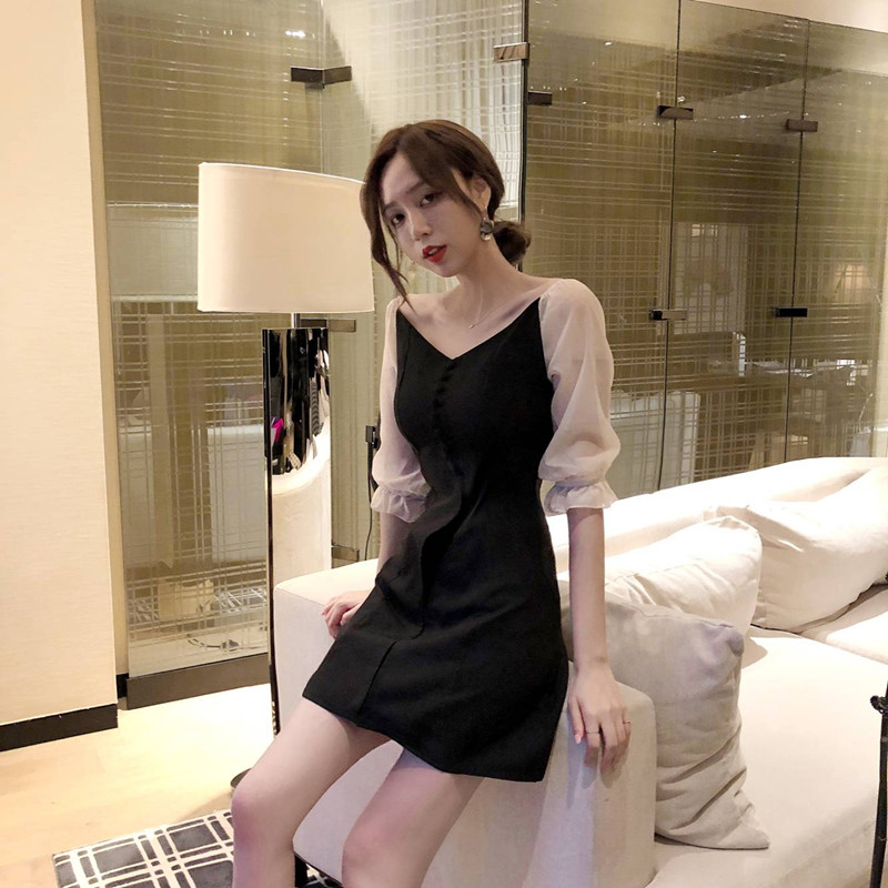 / 新款韓版修身顯瘦chic風網紗拼接高腰修身V領氣質假兩件連衣裙女